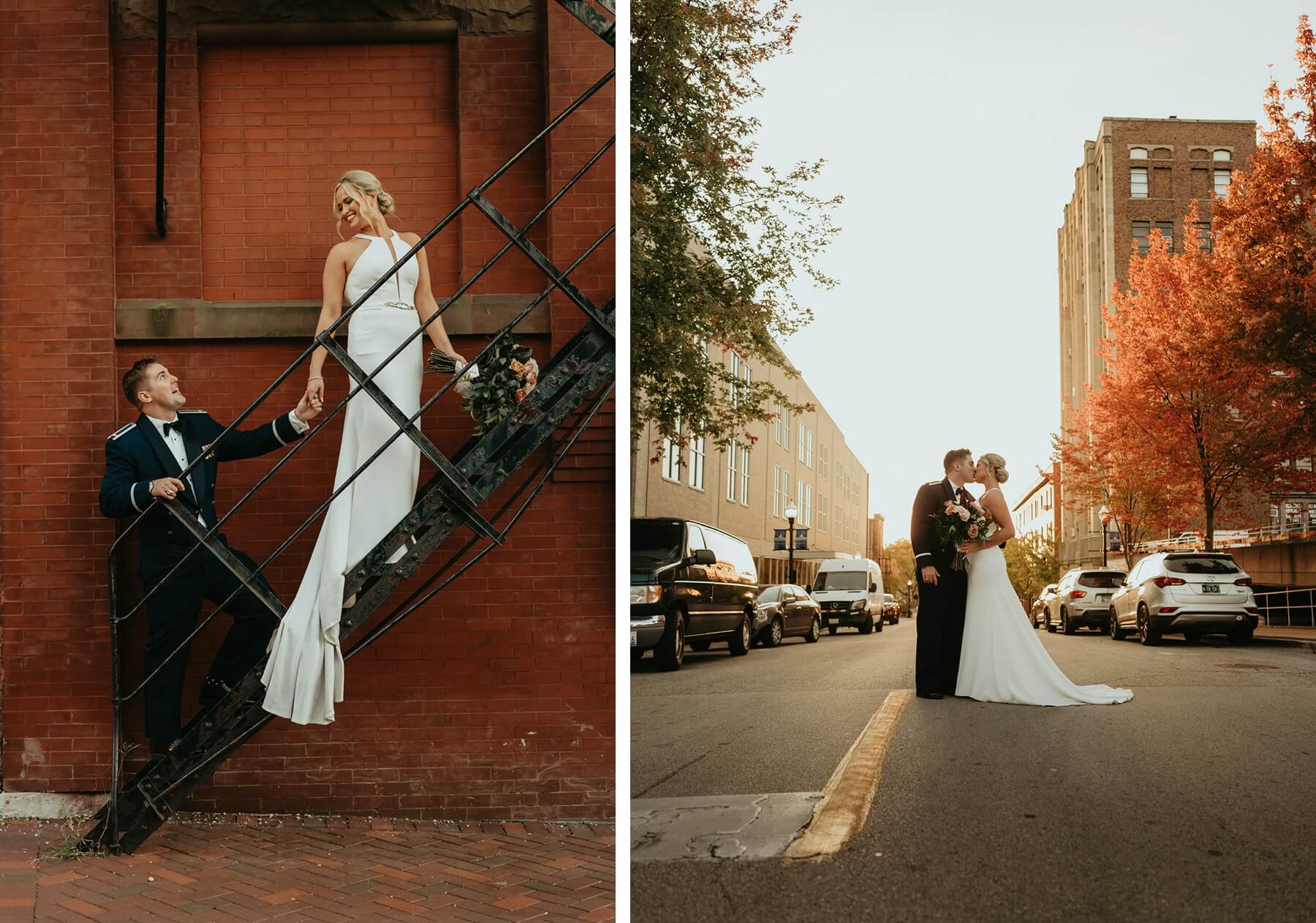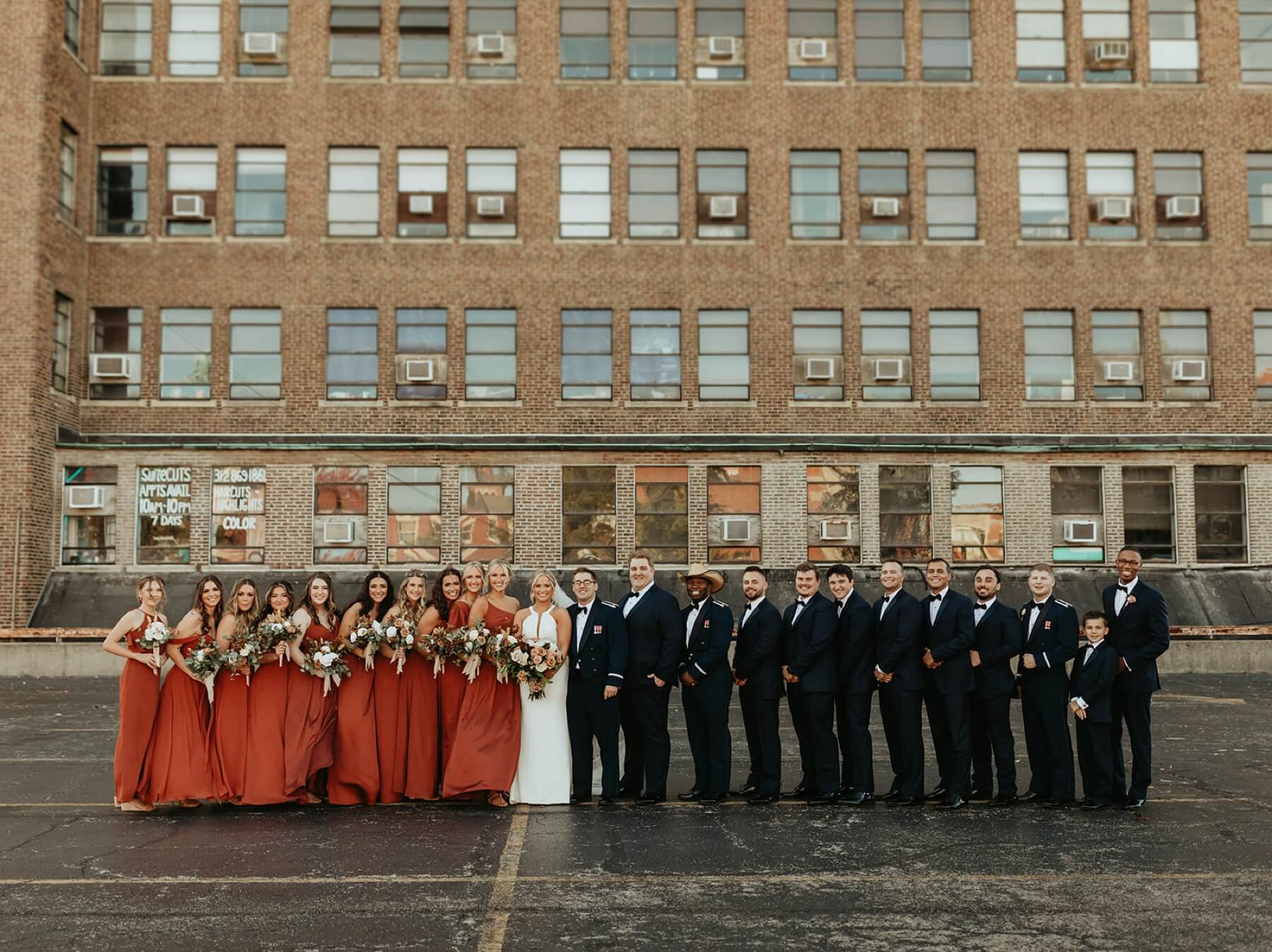 The couple had a traditional Catholic ceremony at St. John Neumann Church. They exchanged personal vows and rings, then sealed their love with a kiss. As the couple exited the church, they had a traditional Air Force saber arch that was done by Trace’s Air Force friends. The couple snapped some photos with their family at the church then headed to downtown Elgin for photos with their bridal party. Erika Parker Photography is a wedding photographer New Orleans.