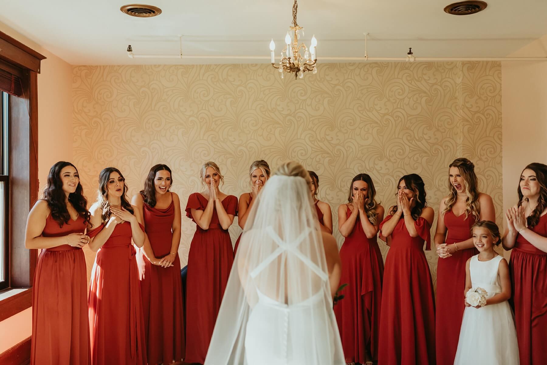 The day began at The Haight as Taylor and her bridesmaids prepped for the day in our suite. After a quick dance party with her bridesmaids, Taylor put on her beautiful form fitting halter dress with a slim cutout on the bodice and an open back. Her bridesmaids wore various styles of burnt orange dresses which were perfect for the fall wedding. Taylor had an emotional first look with her dad on the deck of The Haight then it was time to head to the church for the ceremony.
