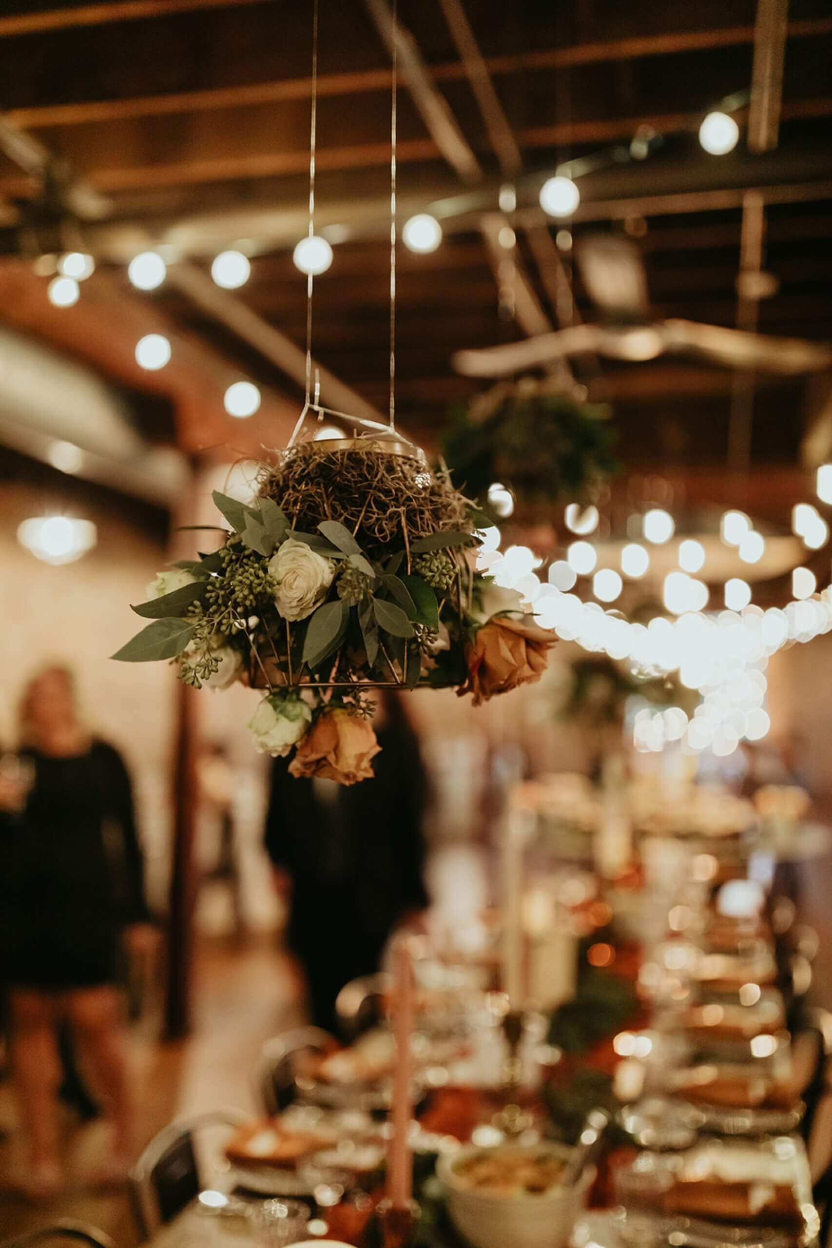 Back at The Haight for their fall wedding reception, burnt orange continued to weave its way through every detail. The venue’s rustic allure provided the perfect canvas for this autumnal celebration. The couple chose white dinnerware with burnt orange napkins for their place settings. The long farmhouse tables had greenery intertwined down the middle along with a mix of amber glass jugs with baby’s breath, taper candles, and pillar candles on tall gold candle holders. The couple also had hanging floral arrangements above the tables that were full of orange, white, and cream flowers and greenery. We loved seeing how all of the details came together to create a warm and inviting atmosphere, much like the elegant setups often found in wedding reception venues that bring every detail to life.