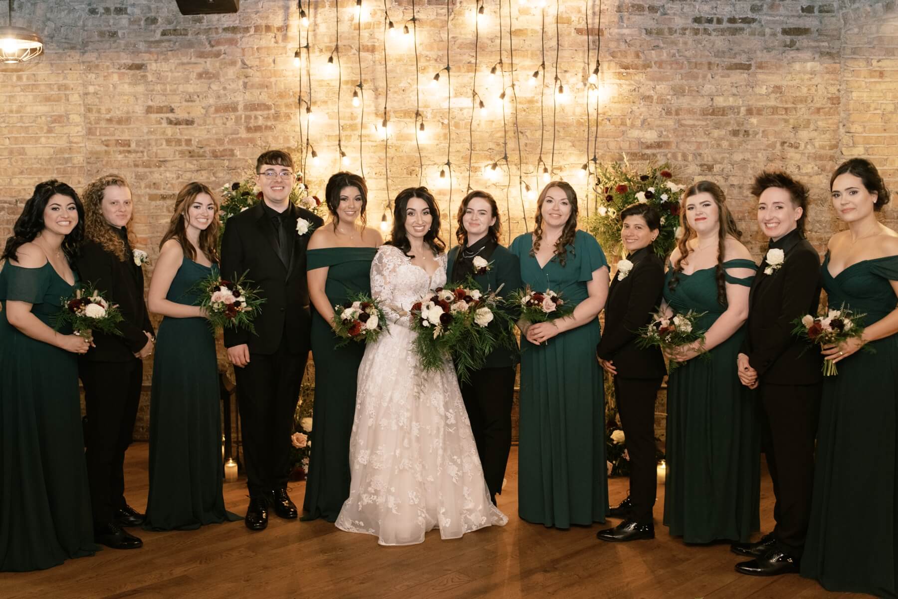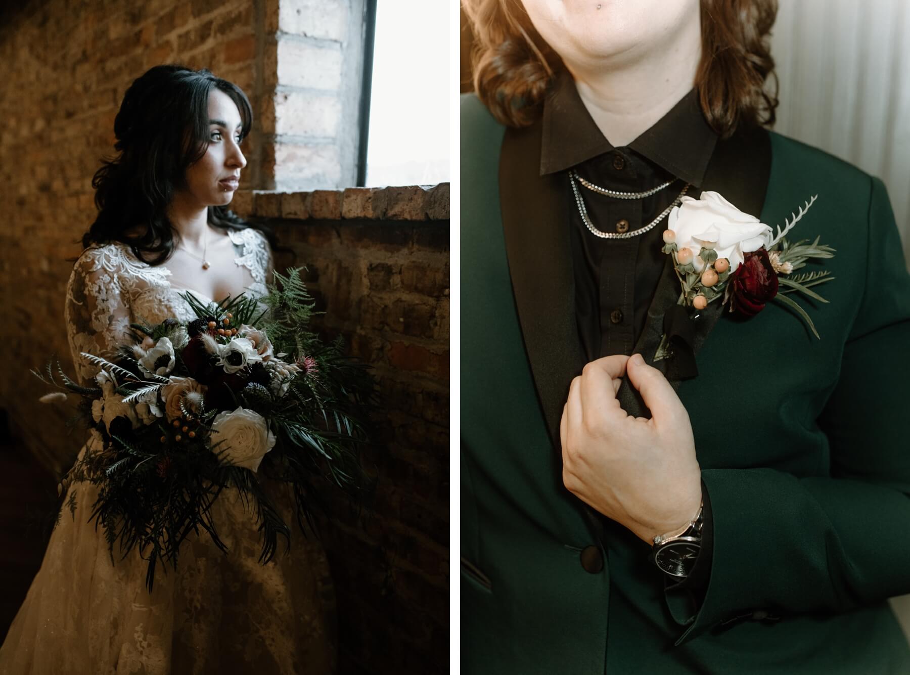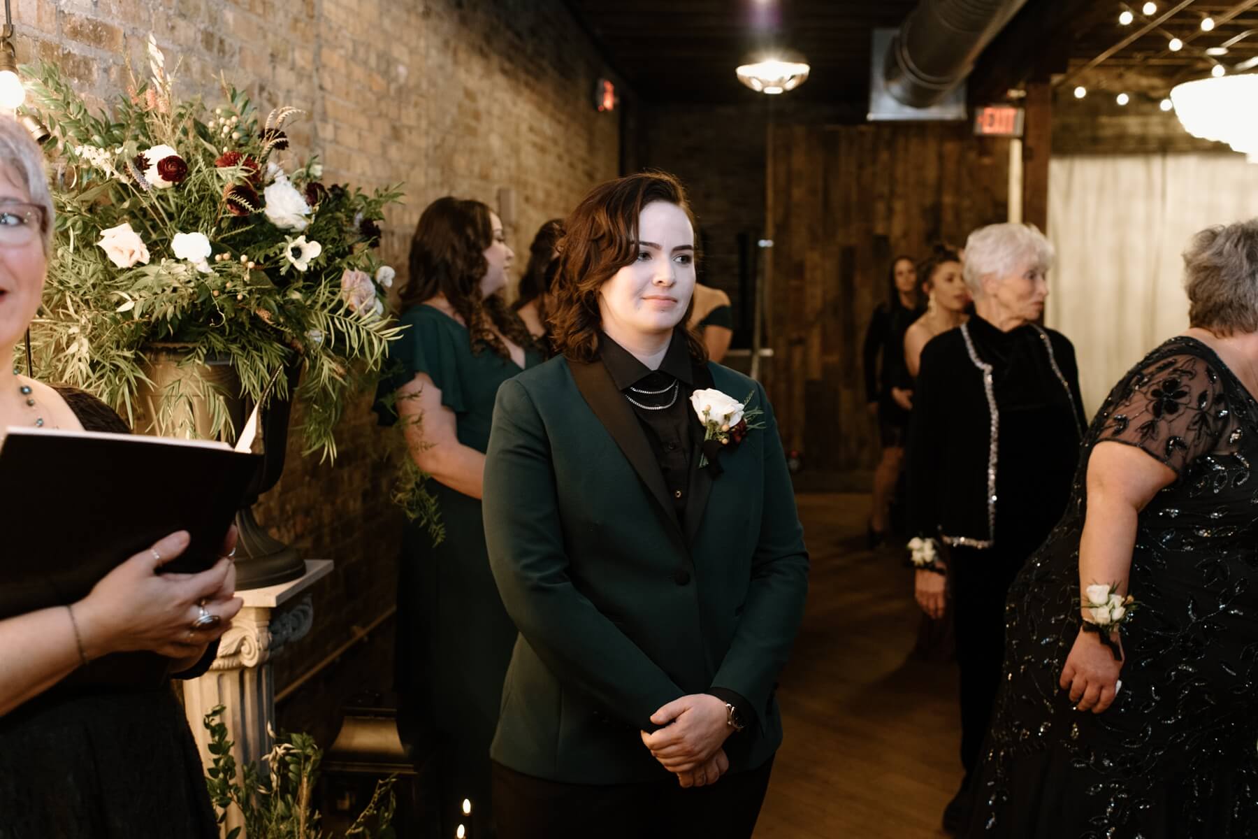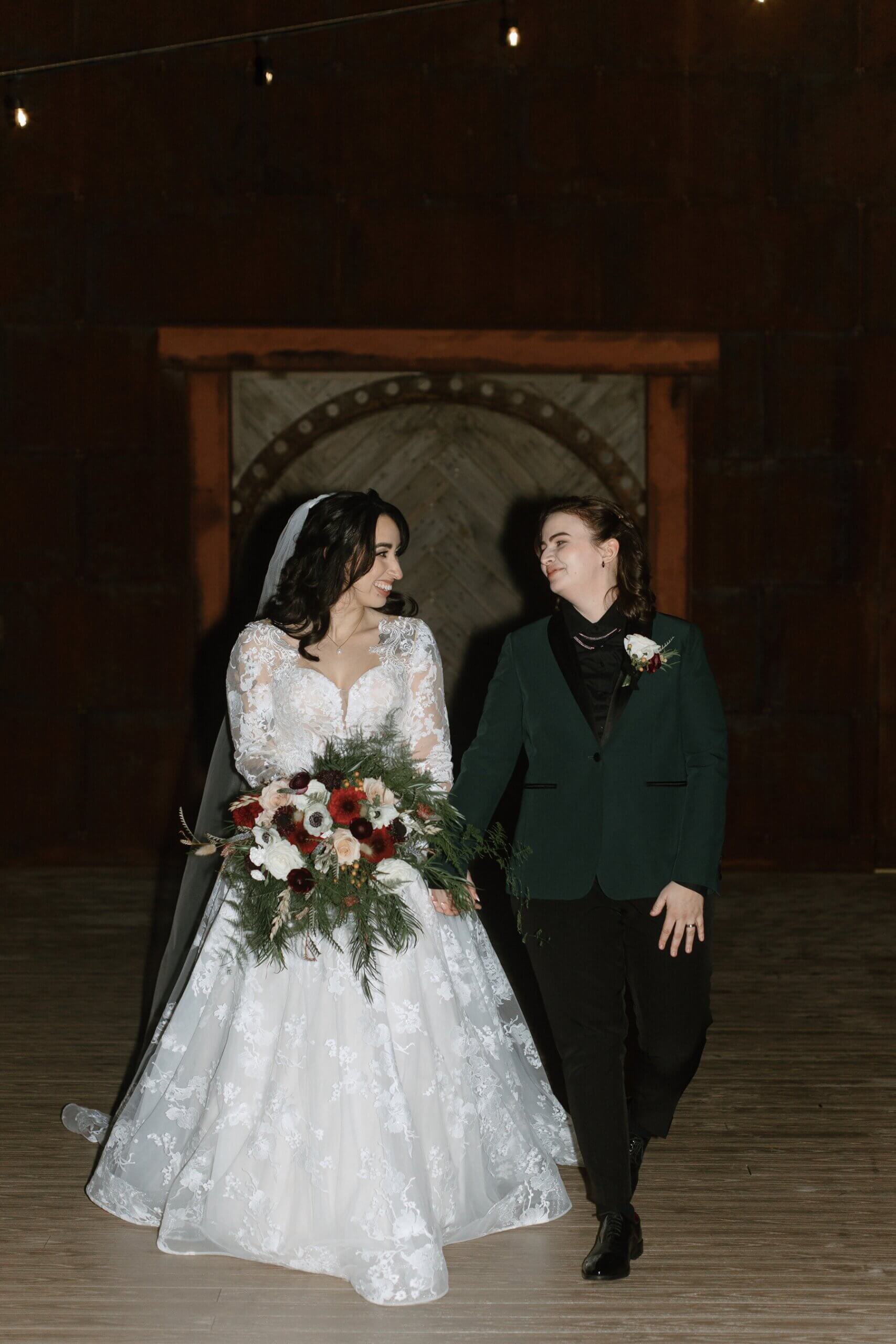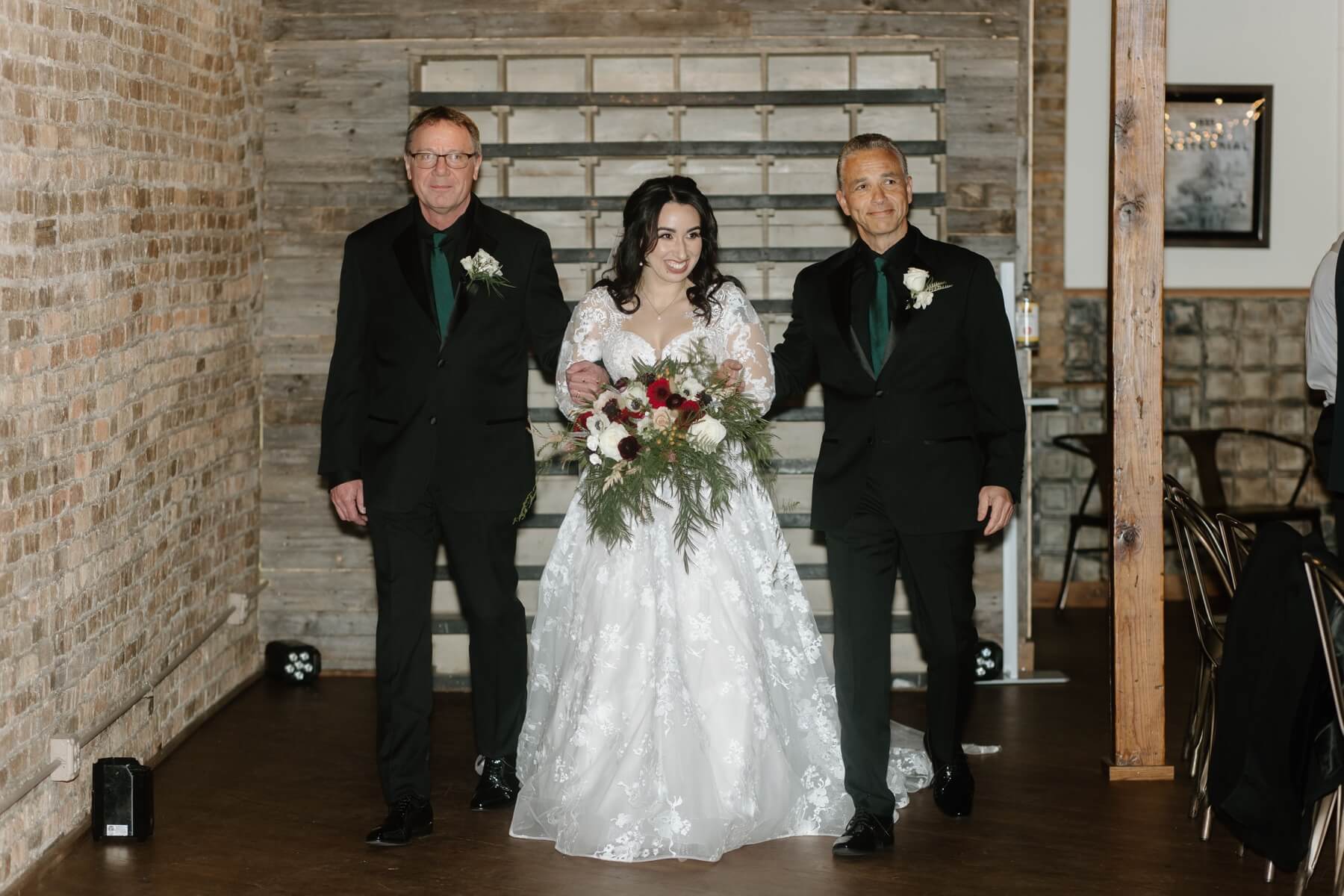 The Haight’s getting ready suite buzzed with excitement as Lindsey got ready to say “I do.” Surrounded by her closest friends and family, Lindsey got dressed with the help of her mom and looked absolutely stunning in an A-line ball gown with lace detailing and long sleeves. She carried a bouquet full of white, red, and pink flowers that were interspersed with greenery. For her outfit, Stephanie chose a forest green suit jacket with a black shirt and black pants. Their outfits were the perfect blend of romantic and modern!