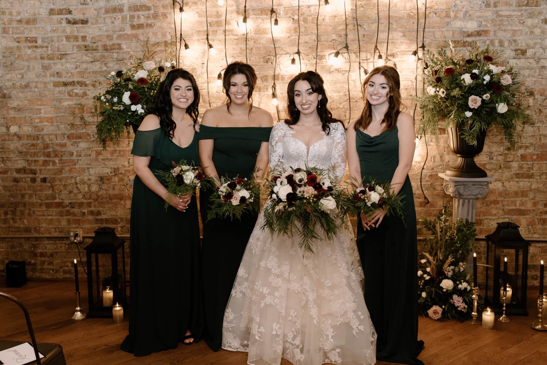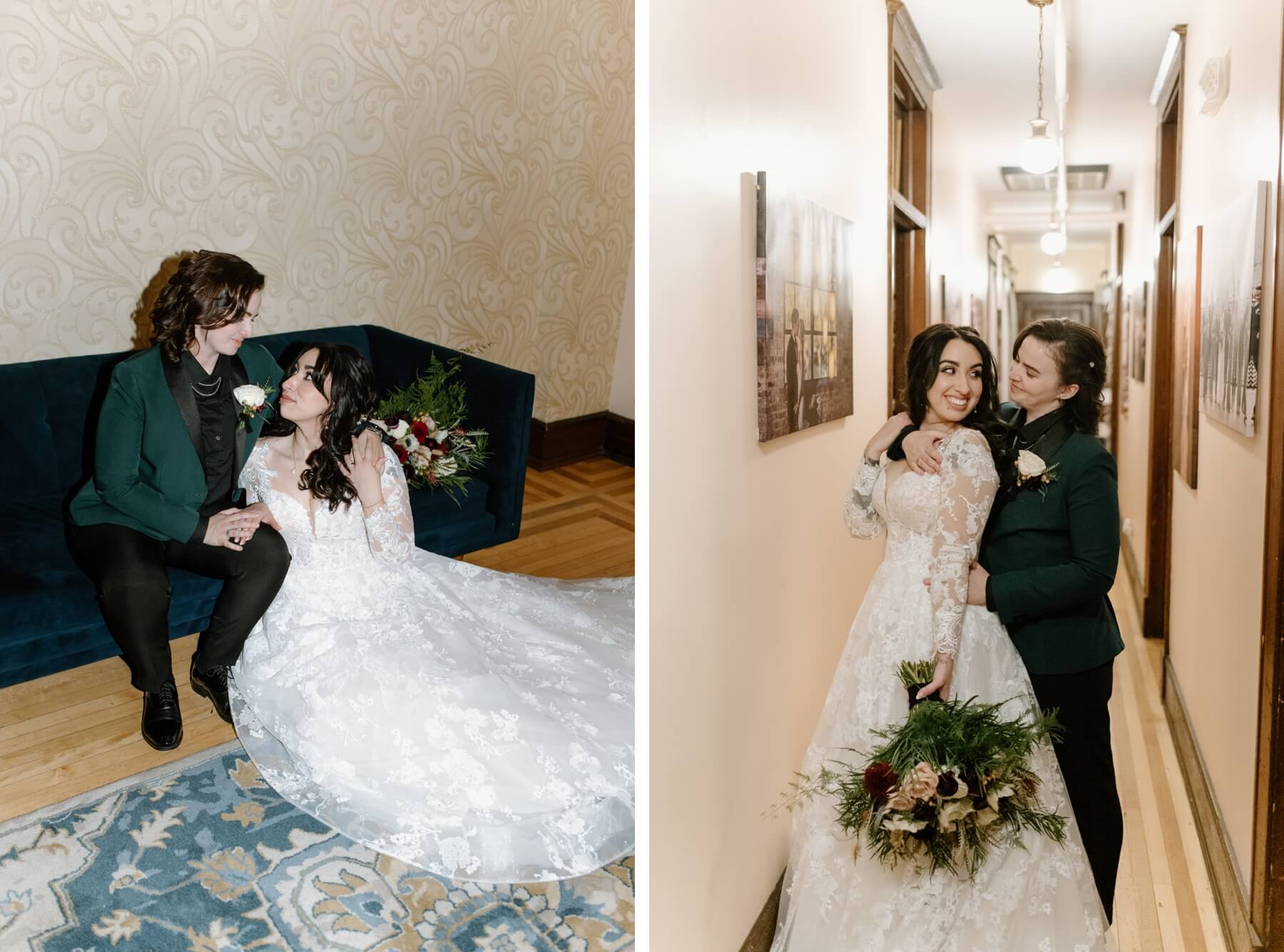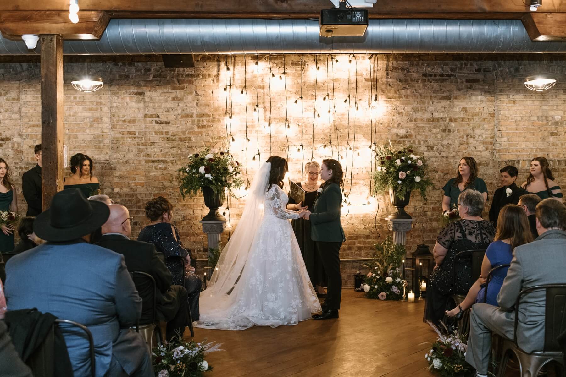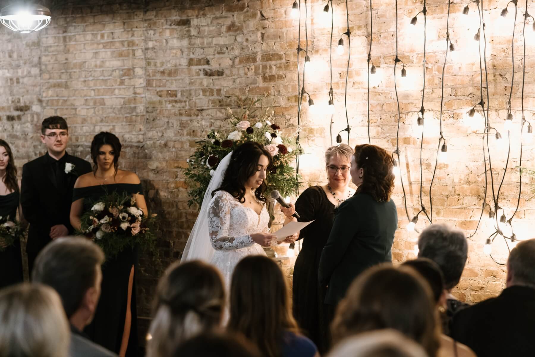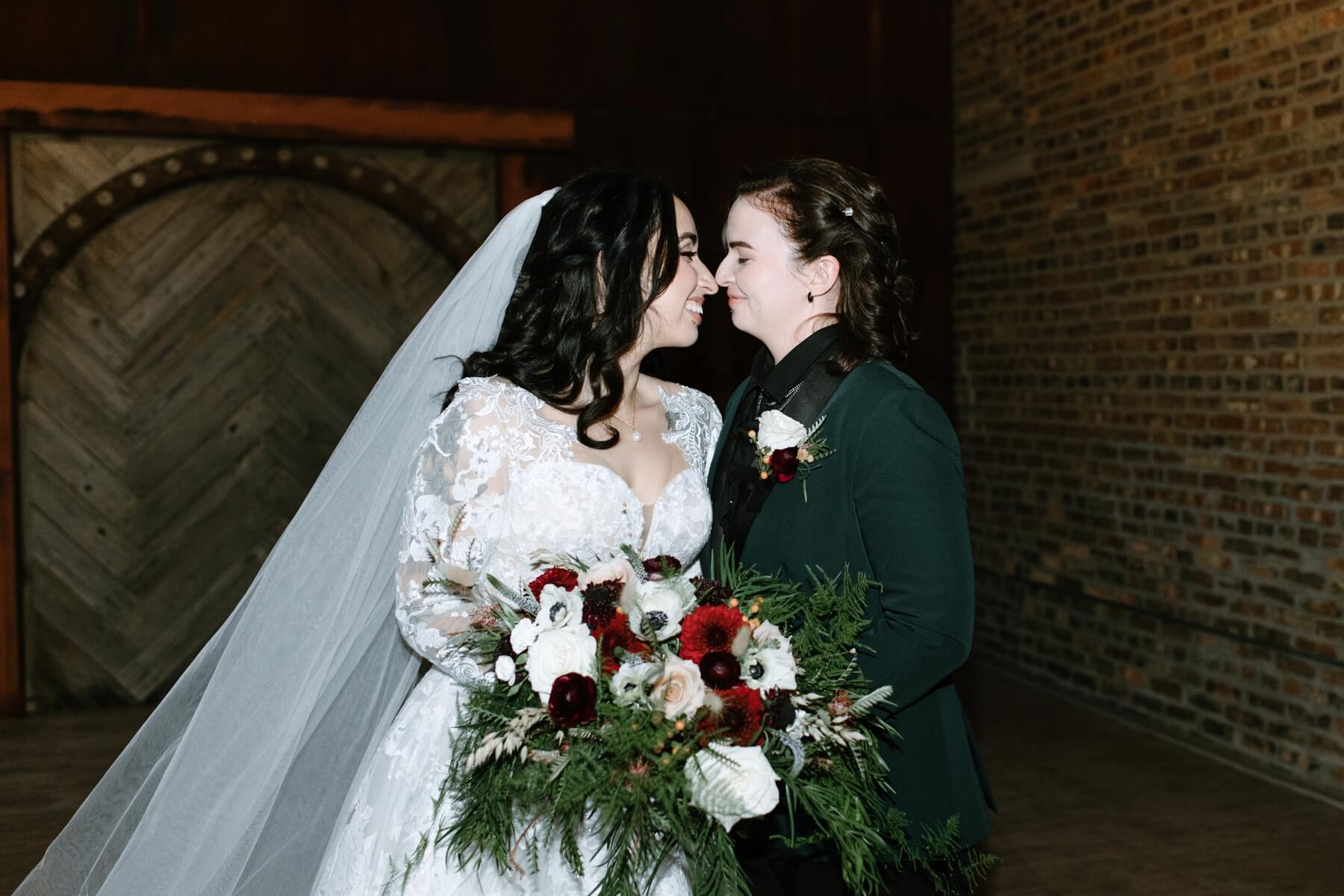 The Haight’s getting ready suite buzzed with excitement as Lindsey got ready to say “I do.” Surrounded by her closest friends and family, Lindsey got dressed with the help of her mom and looked absolutely stunning in an A-line ball gown with lace detailing and long sleeves. She carried a bouquet full of white, red, and pink flowers that were interspersed with greenery. For her outfit, Stephanie chose a forest green suit jacket with a black shirt and black pants. Their outfits were the perfect blend of romantic and modern!