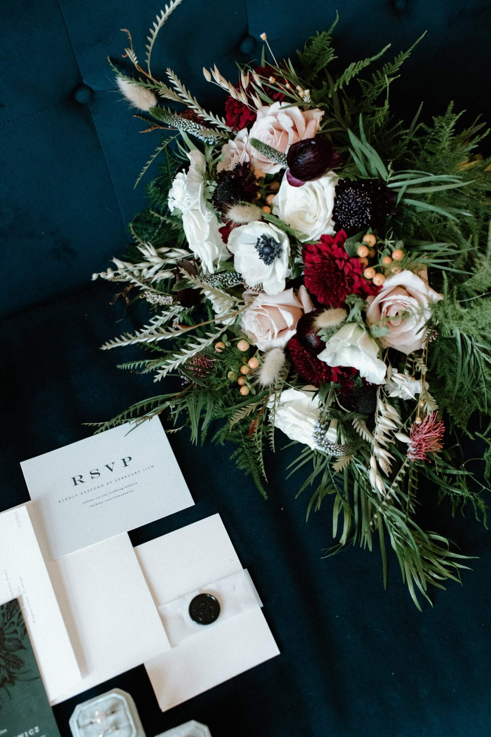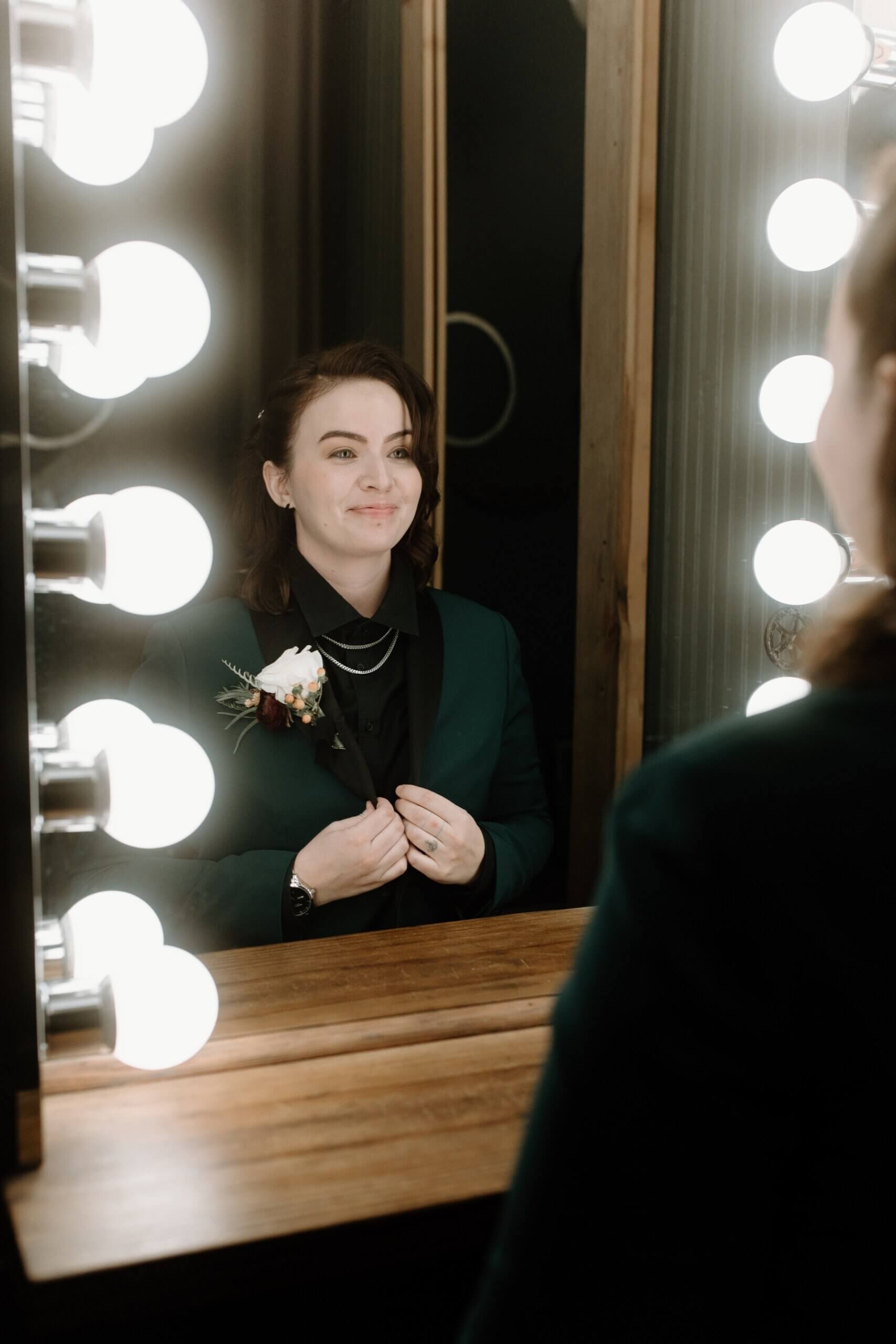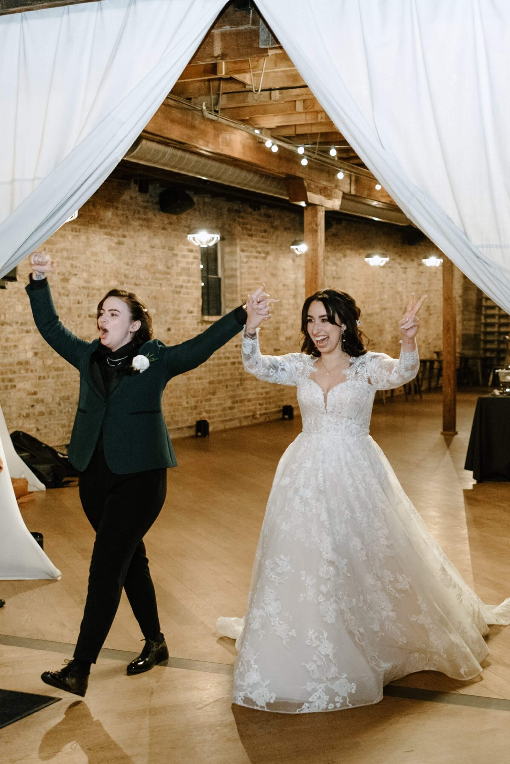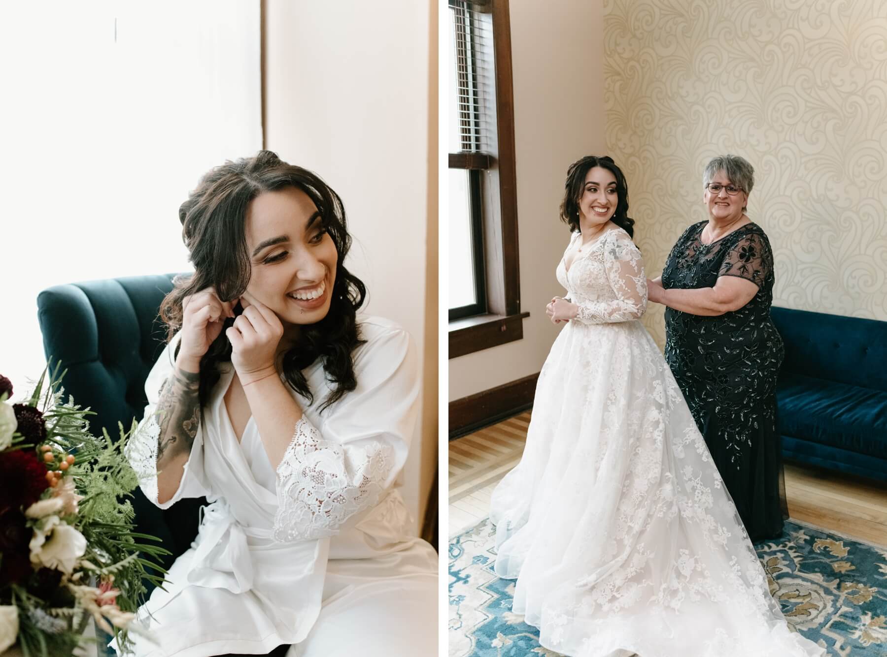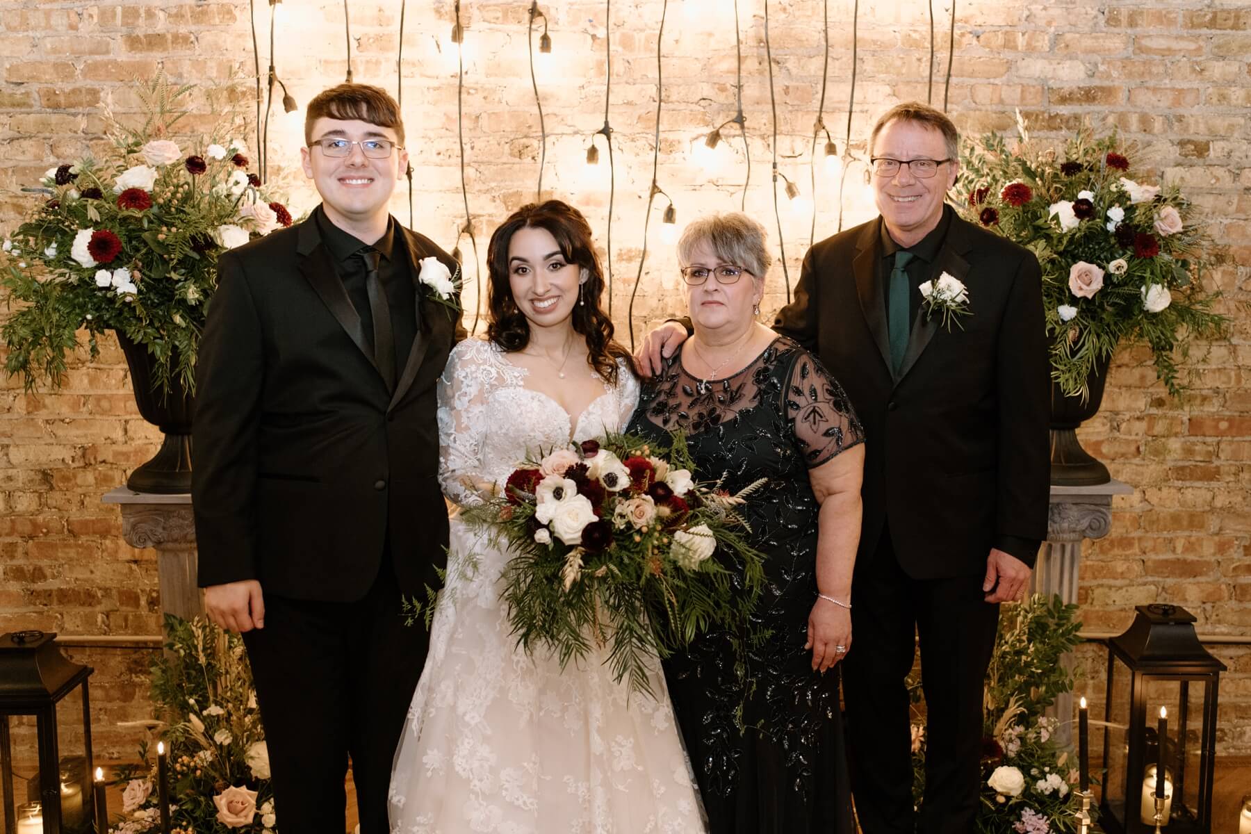 The Haight’s getting ready suite buzzed with excitement as Lindsey got ready to say “I do.” Surrounded by her closest friends and family, Lindsey got dressed with the help of her mom and looked absolutely stunning in an A-line ball gown with lace detailing and long sleeves. She carried a bouquet full of white, red, and pink flowers that were interspersed with greenery. For her outfit, Stephanie chose a forest green suit jacket with a black shirt and black pants. Their outfits were the perfect blend of romantic and modern!