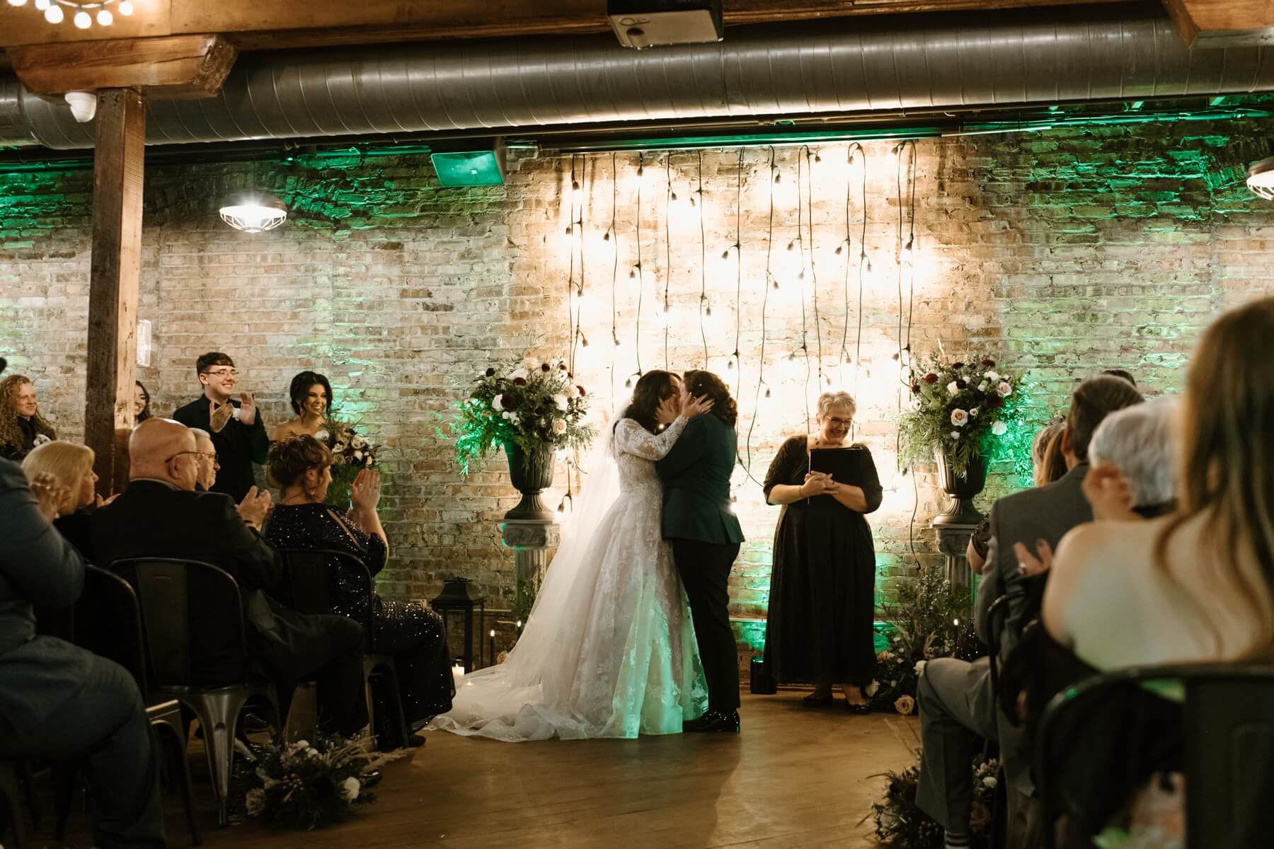 Under the picturesque wooden beams of The Haight, Stephanie and Lindsey exchanged heartfelt vows. The ceremony’s modern elegance was accentuated with moody décor which included Edison lights as the ceremony backdrop and floral arrangements full of greenery with pops of white and burgundy flowers. As they sealed their vows with a kiss, joyous cheers filled the air, celebrating the union of two beautiful souls.