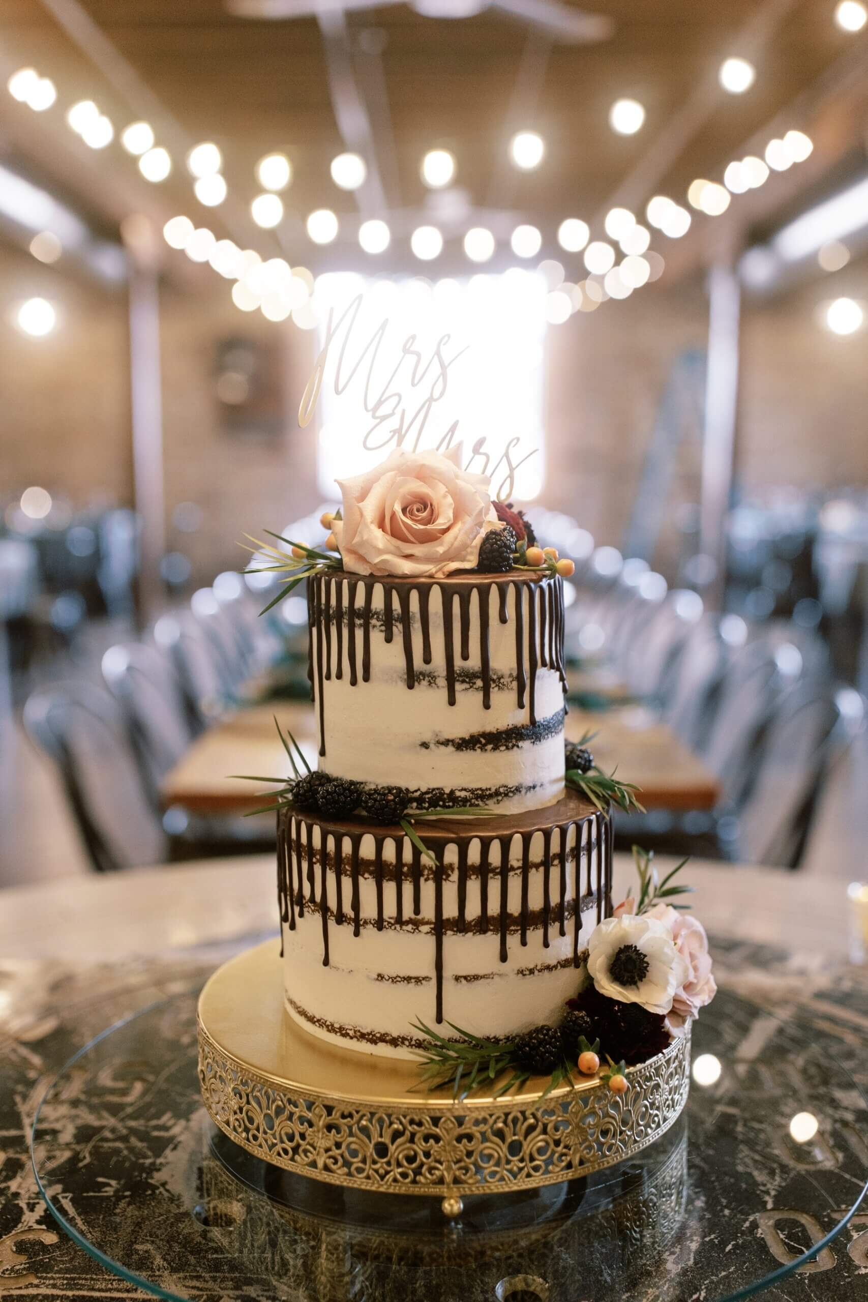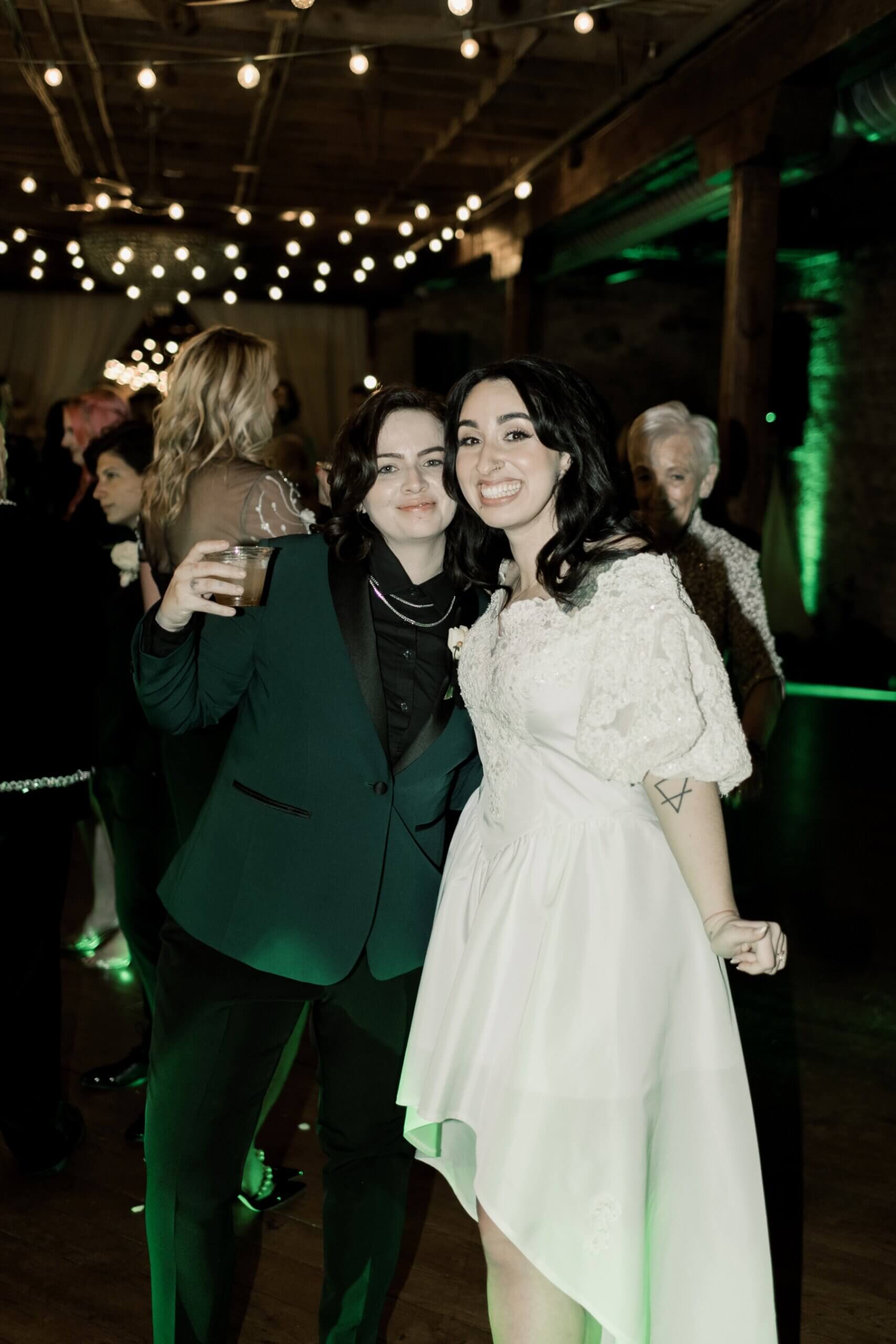 For the reception, The Haight was transformed into a moody, modern wonderland. For the elegant green and black wedding, the couple chose to decorate the tables with white and red flowers and greenery along with black taper candles and dark green napkins on top of white plates. For their wedding cake, Stephanie and Lindsey chose a two tier semi-naked cake that had black icing dripping down the sides. The cake was perfect for their green and black wedding!