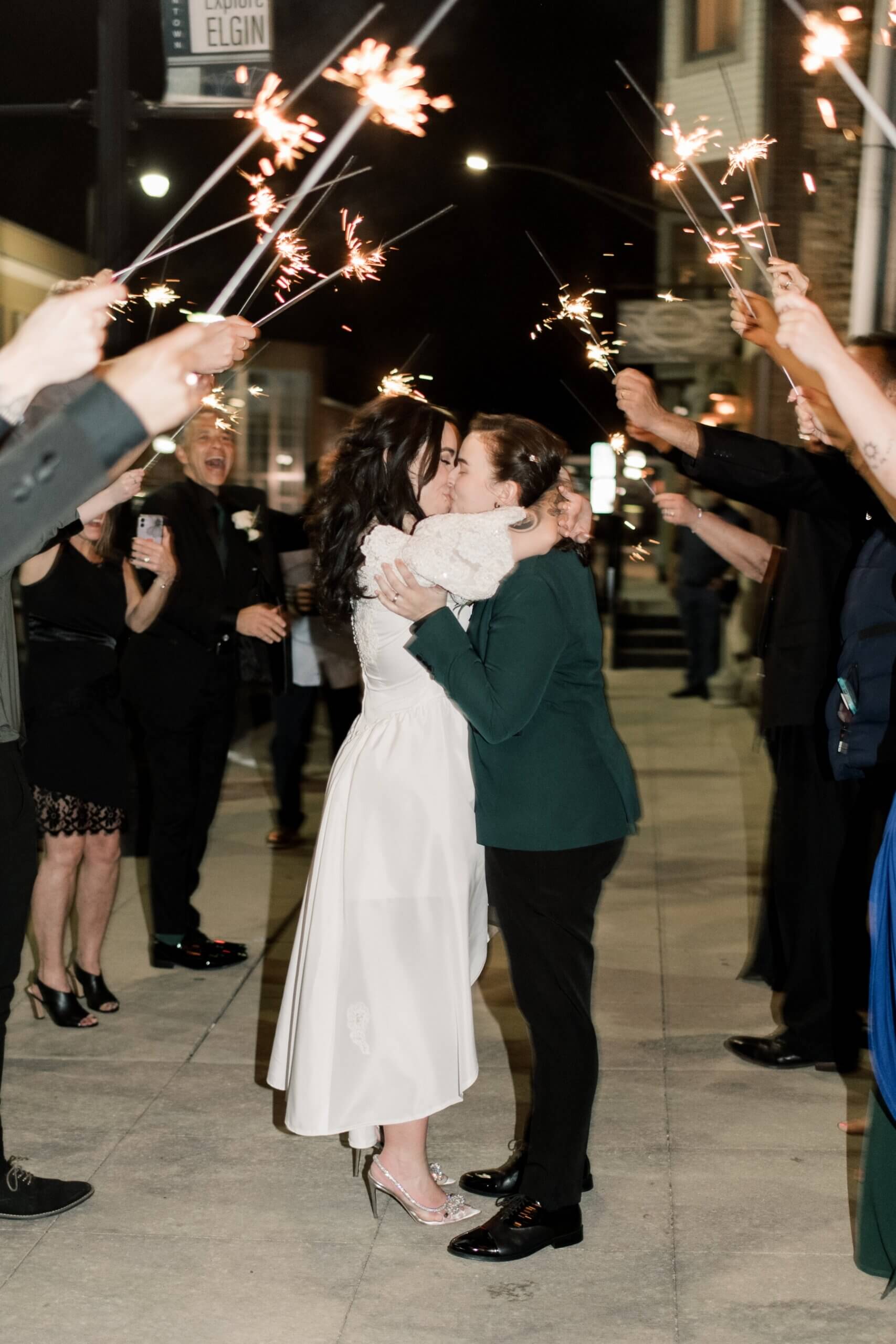 The Haight’s getting ready suite buzzed with excitement as Lindsey got ready to say “I do.” Surrounded by her closest friends and family, Lindsey got dressed with the help of her mom and looked absolutely stunning in an A-line ball gown with lace detailing and long sleeves. She carried a bouquet full of white, red, and pink flowers that were interspersed with greenery. For her outfit, Stephanie chose a forest green suit jacket with a black shirt and black pants,looking sharp and confident in an ensemble like this suit from Opal Formal Wear. Their outfits were the perfect blend of romantic and modern, and slipping into flip flops later in the evening added a relaxed, stylish comfort that kept the celebration going well into the night.