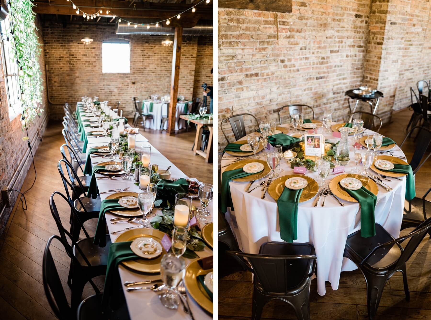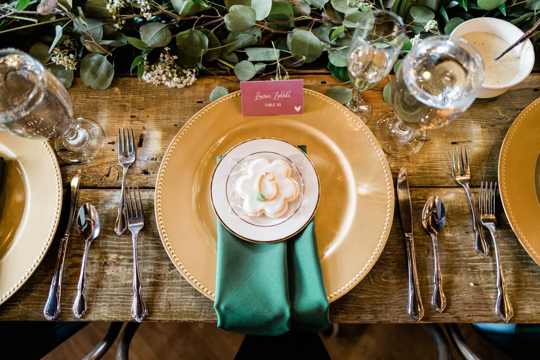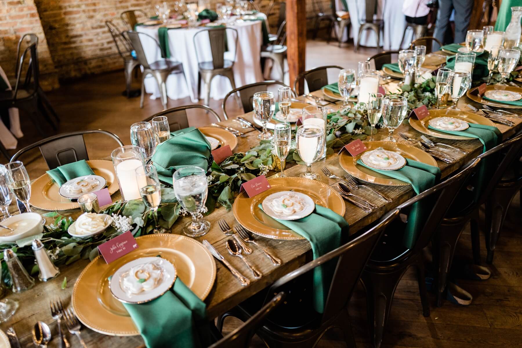 For the reception decor, Hannah and Brett embraced a classic theme, using gold chargers and green napkins that added a touch of sophistication to the tables. The tables, adorned with lush greenery, exuded a sense of romance and elegance. To amplify the atmosphere, the couple incorporated our ivy wall and candles, creating an enchanting ambiance that set the stage for the evening’s festivities.