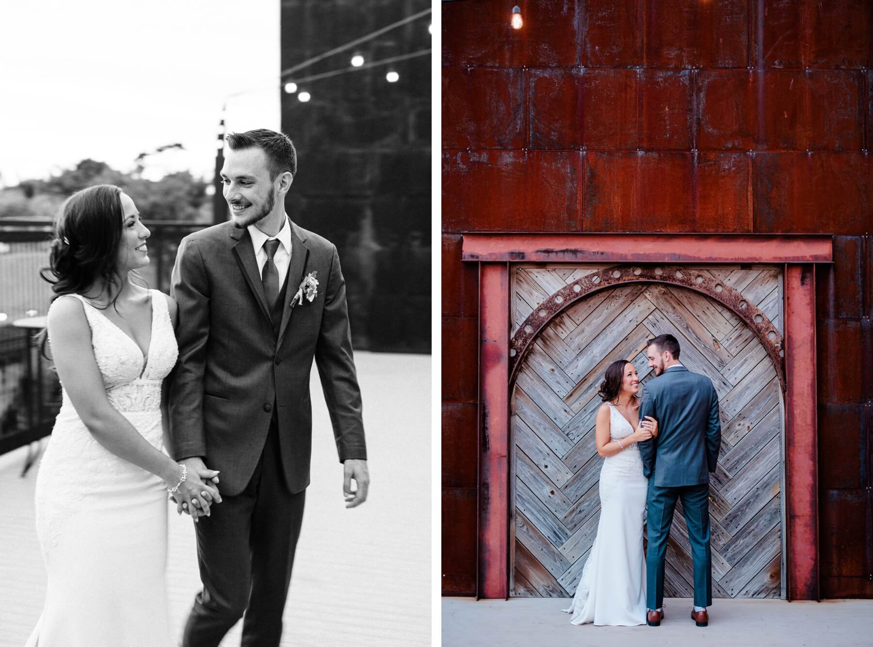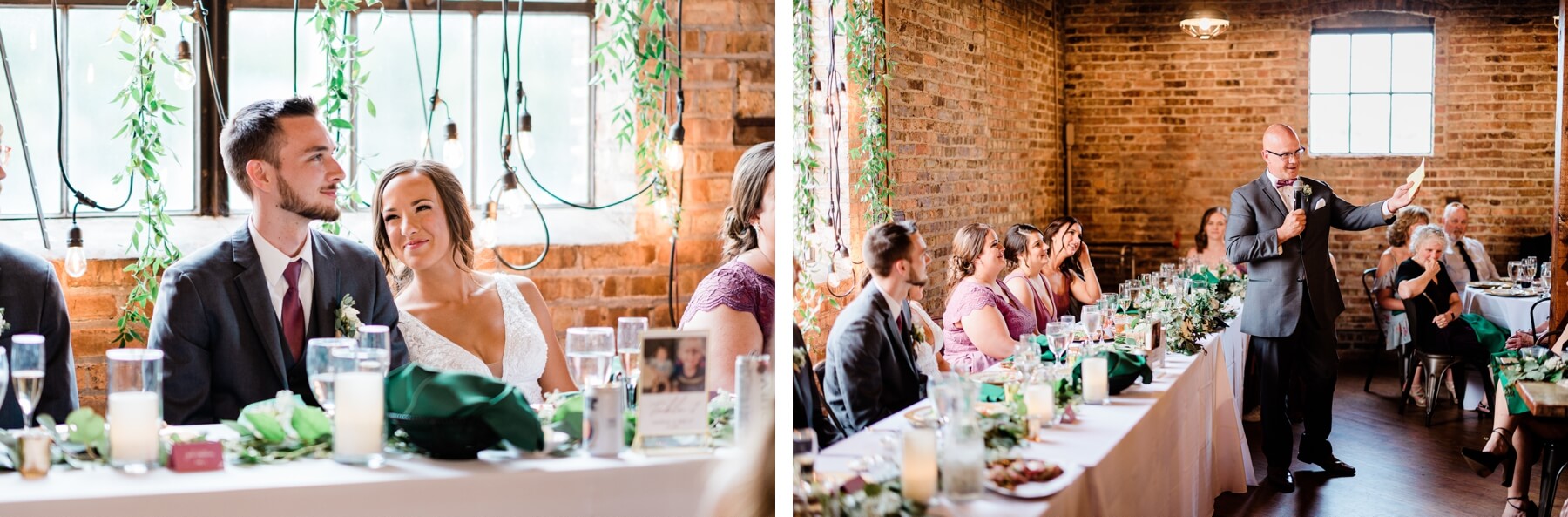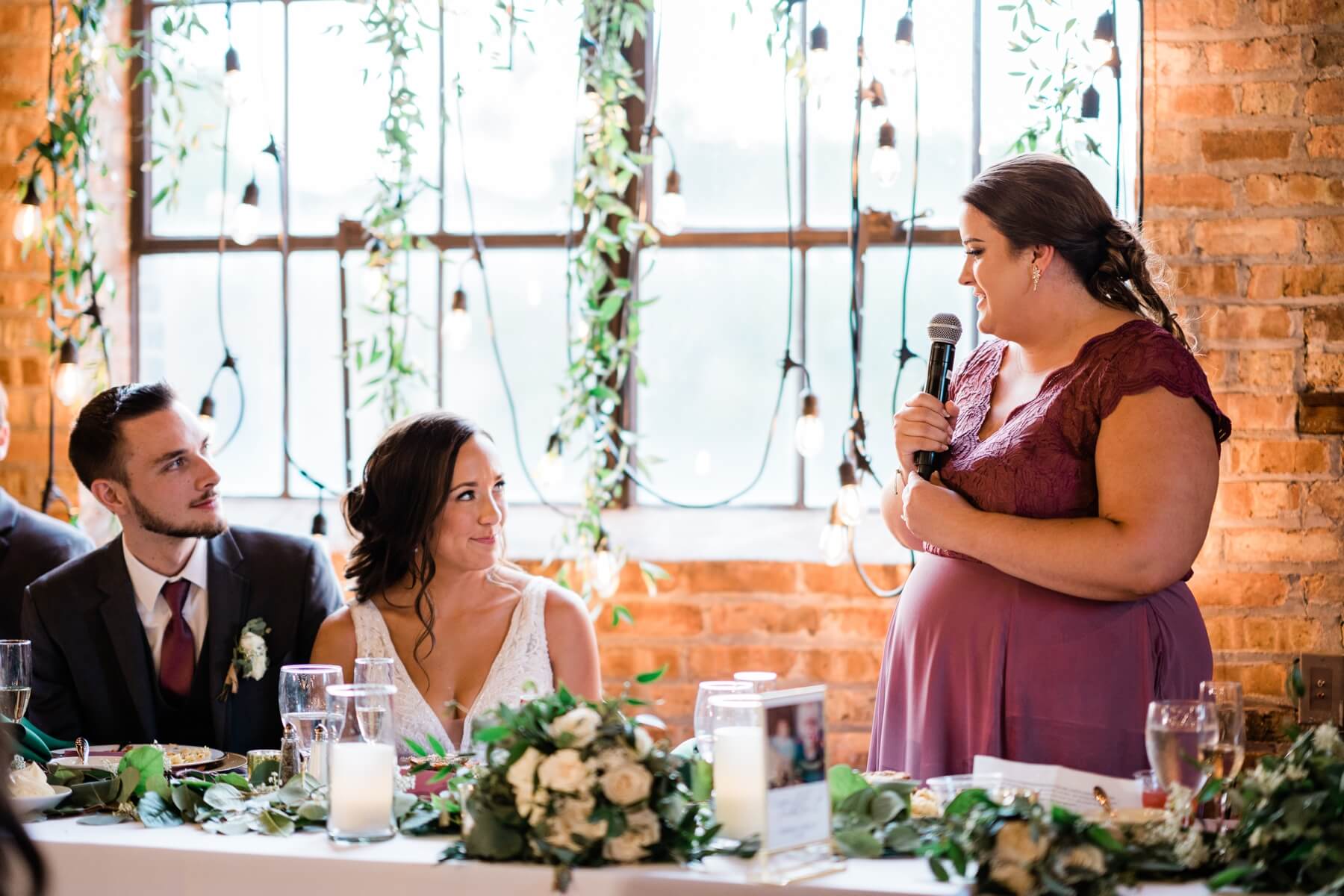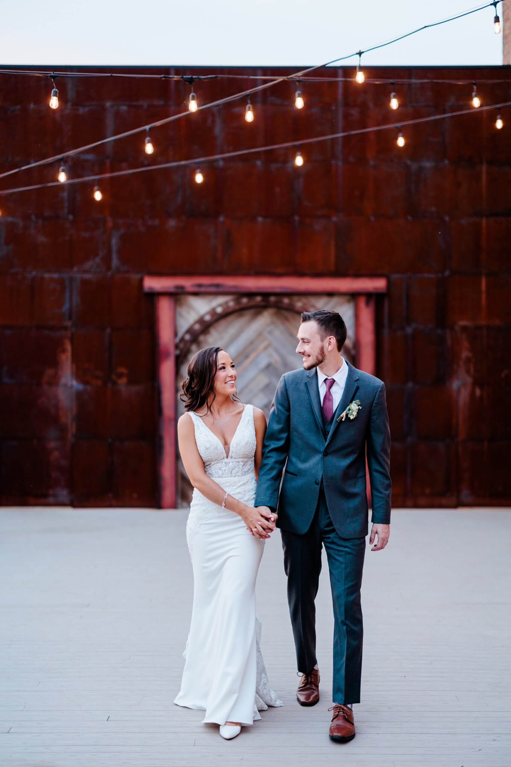 The evening continued with touching speeches from Hannah’s dad, the maid of honor, and the best man, each adding a unique and personal touch to the celebration. As the sun began to set, Hannah and Brett stole a moment to capture the golden hour’s enchanting light with photos around our industrial wedding venue, capturing memories that will last a lifetime.