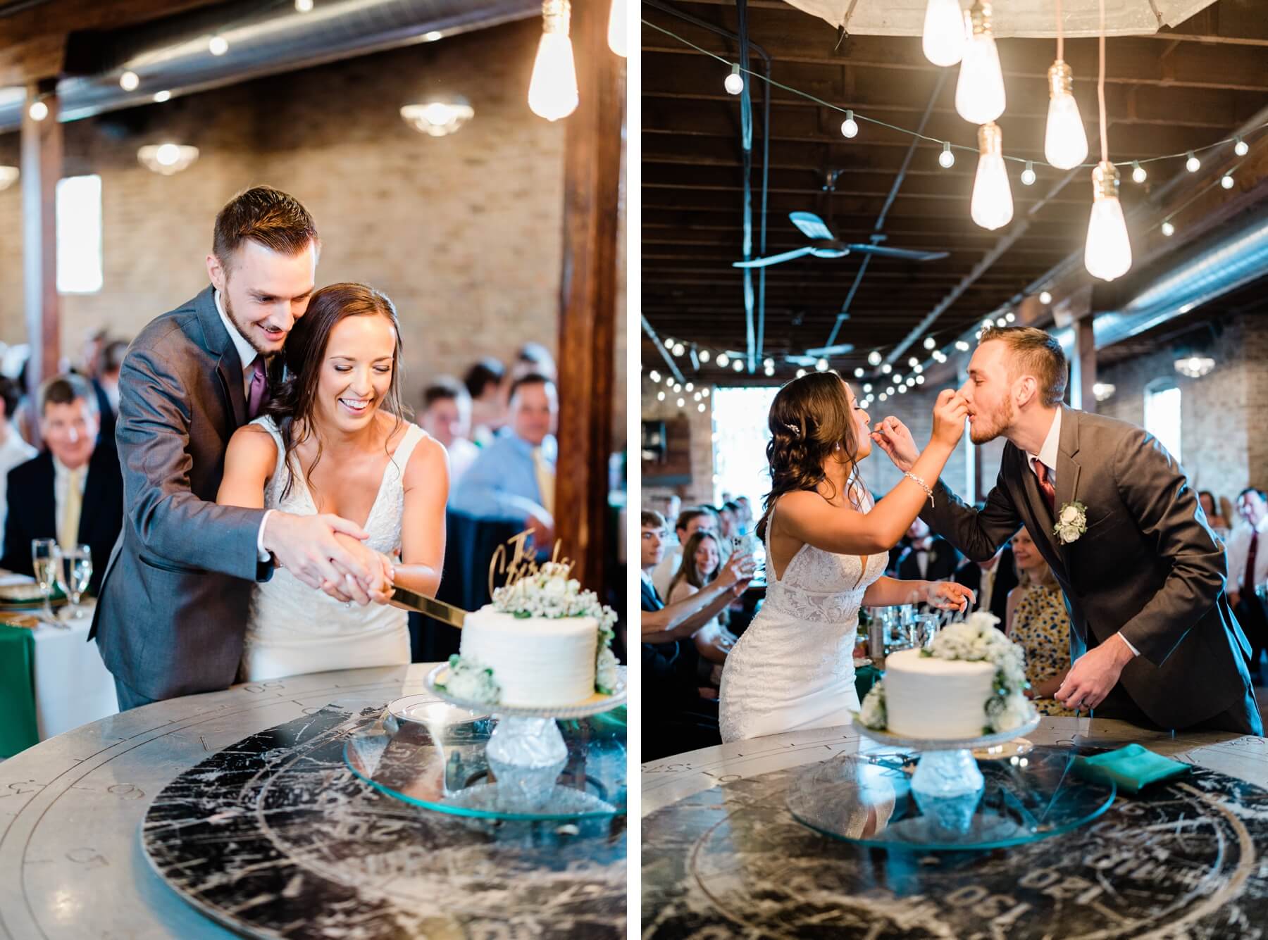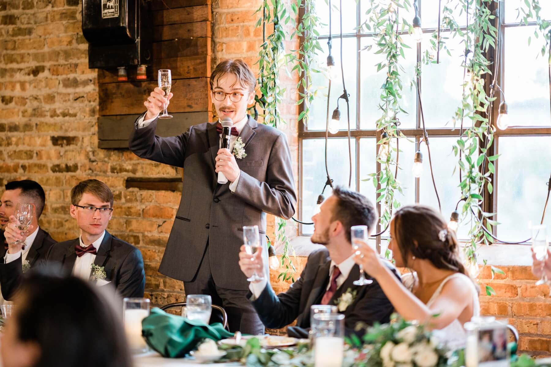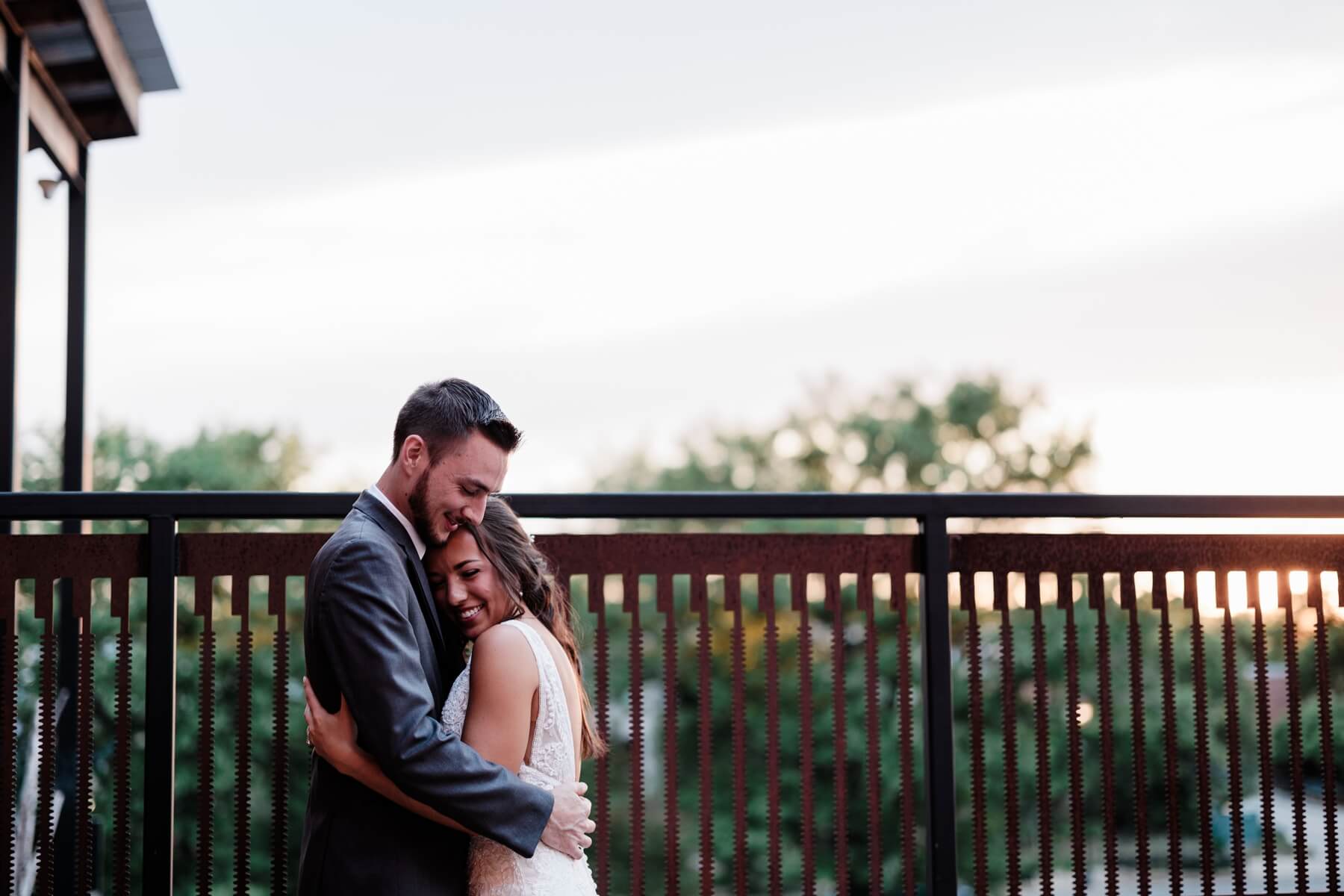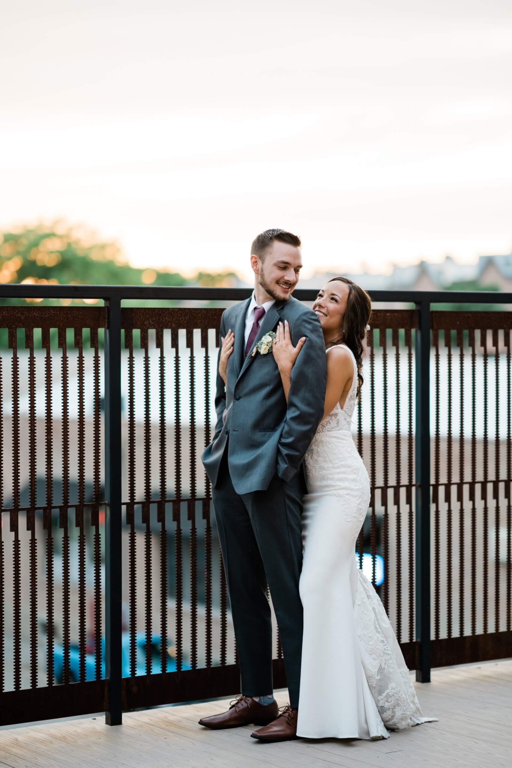 The evening continued with touching speeches from Hannah’s dad, the maid of honor, and the best man, each adding a unique and personal touch to the celebration. As the sun began to set, Hannah and Brett stole a moment to capture the golden hour’s enchanting light with photos around our industrial wedding venue, capturing memories that will last a lifetime.