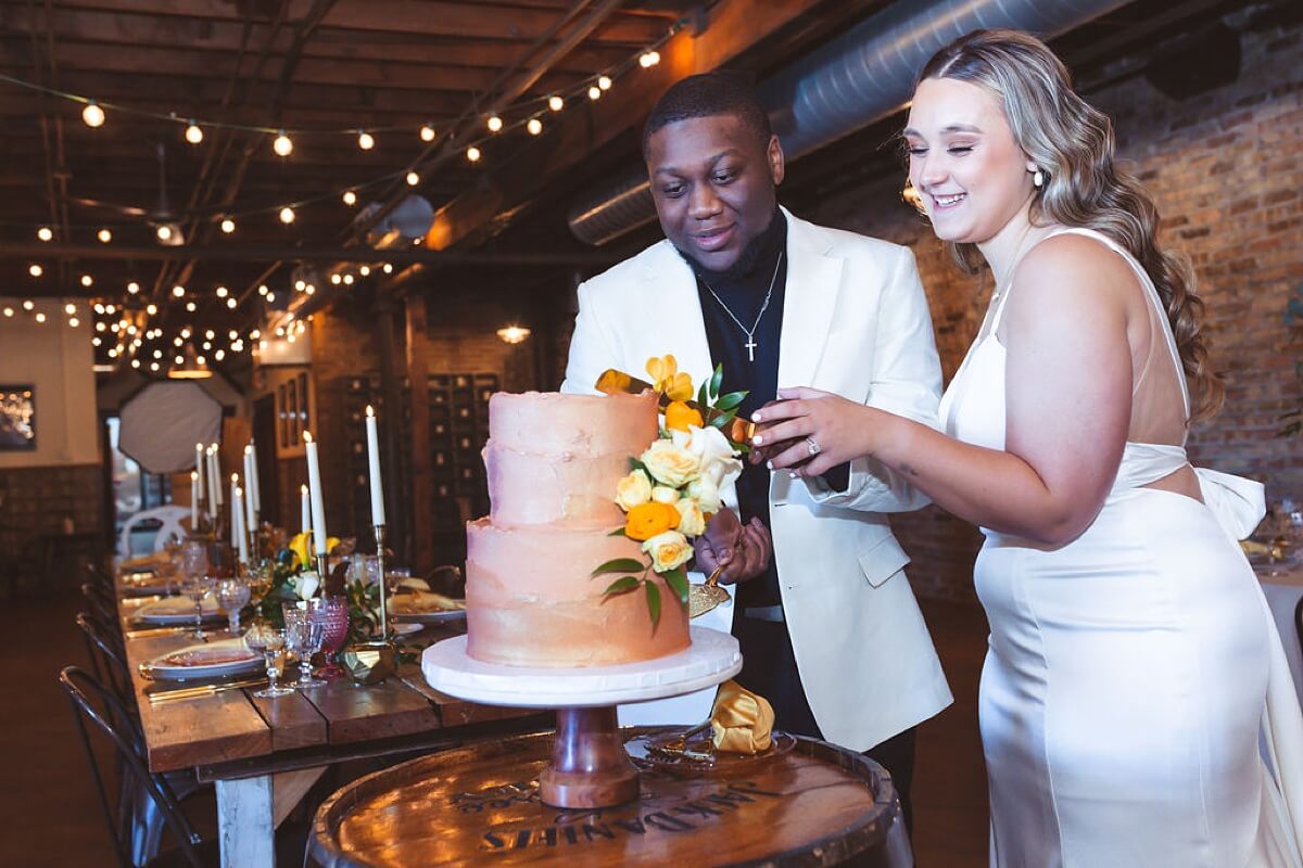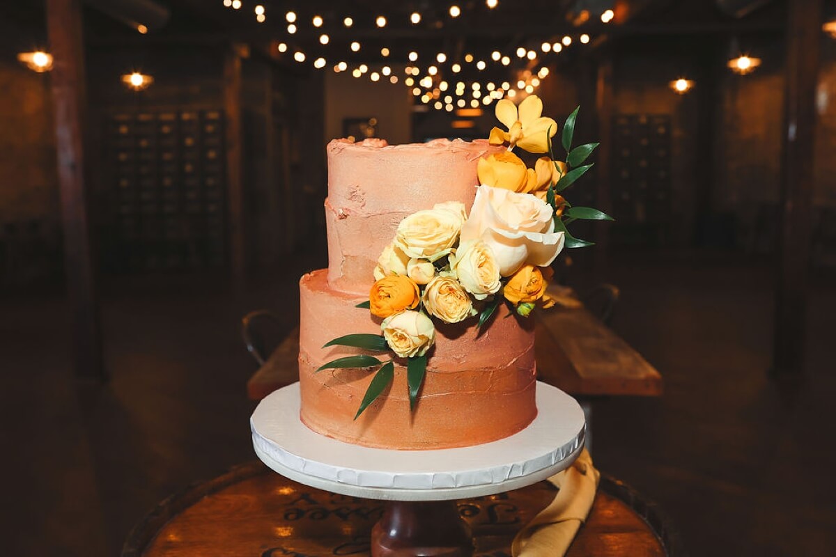 There were several small details throughout the shoot that we loved. First was the whisky bar, which was set on top of a Jack Daniels barrel. We had a custom whisky bar menu with gold font that went great with the theme. We also loved that The Bar designed a few custom cocktails, including a yellow one, to go with the theme. Sugar on Top Bakery created a two tier golden cake with fresh yellow flowers that was the perfect addition to the shoot.