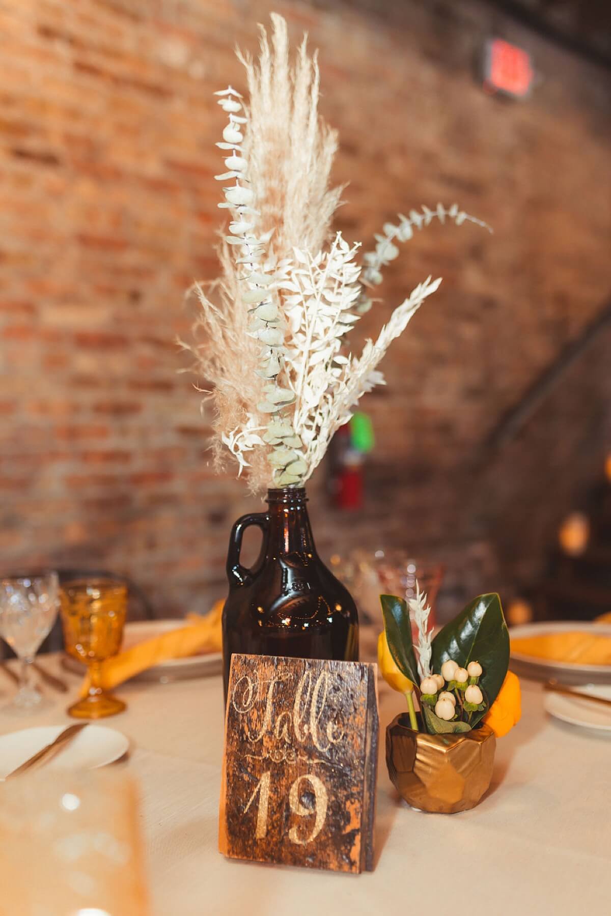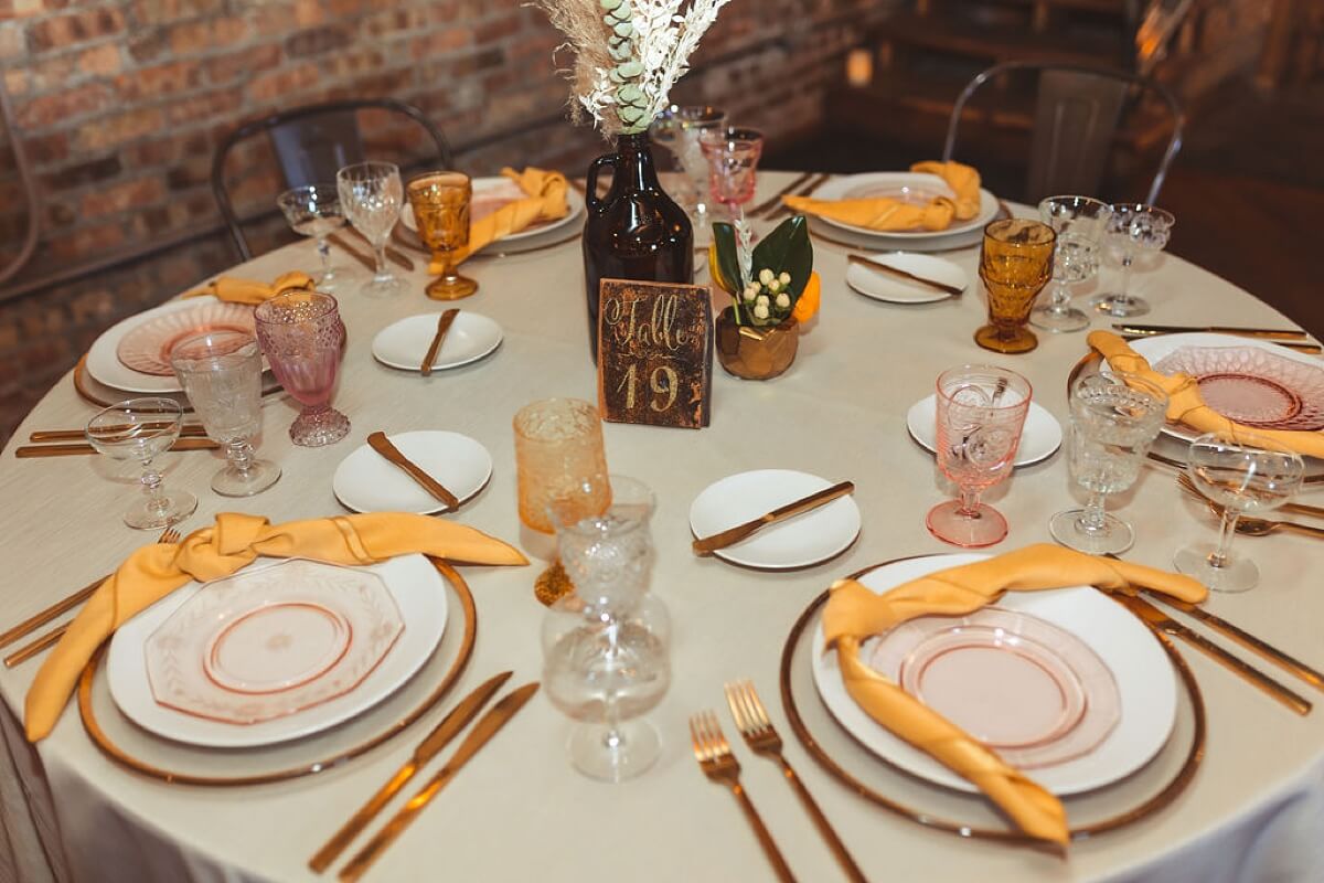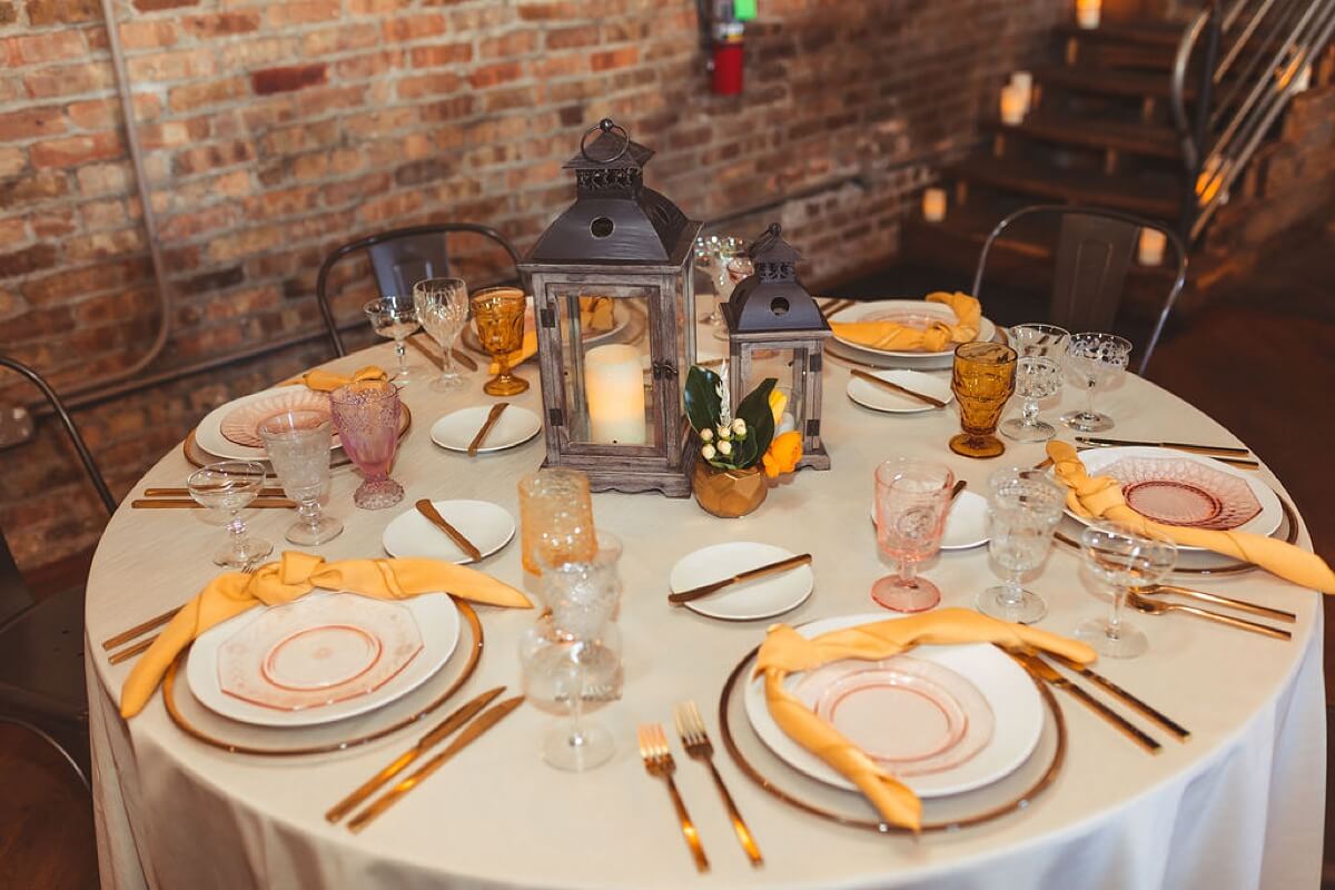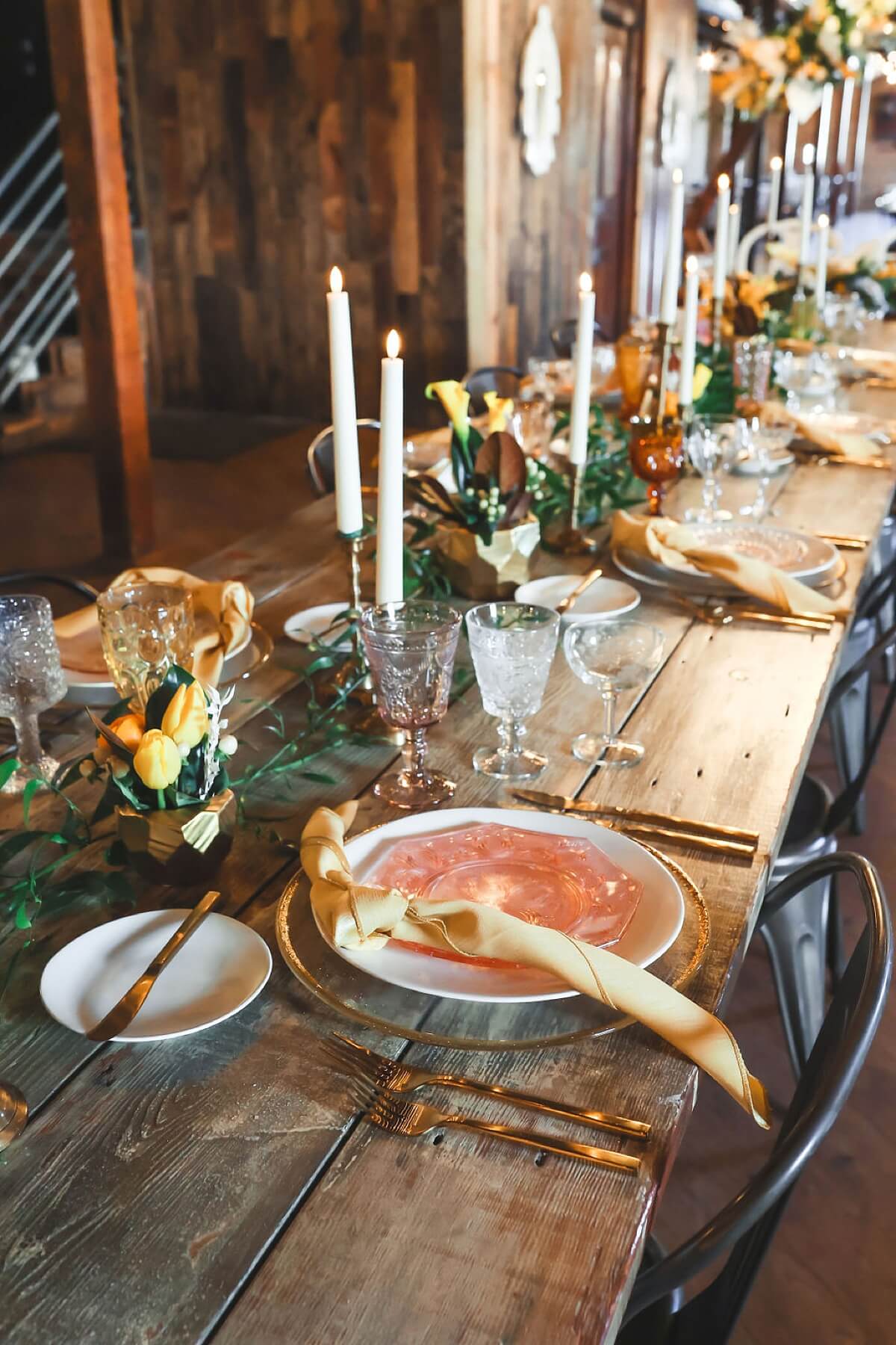 For the centerpieces, we incorporated a variety of our centerpieces which are available for rent at The Haight. This included wood table numbers with gold font, wood lanterns, and candlesticks in various heights. Town & Country Gardens designed gorgeous floral arrangements featuring bold yellow flowers that looked stunning on the tables. We especially loved the arrangements on the sweetheart table and the backdrop!