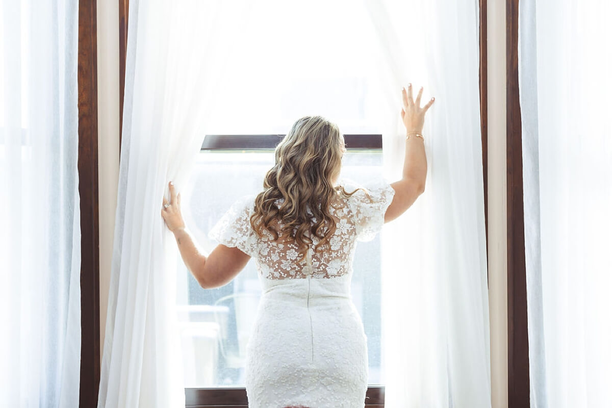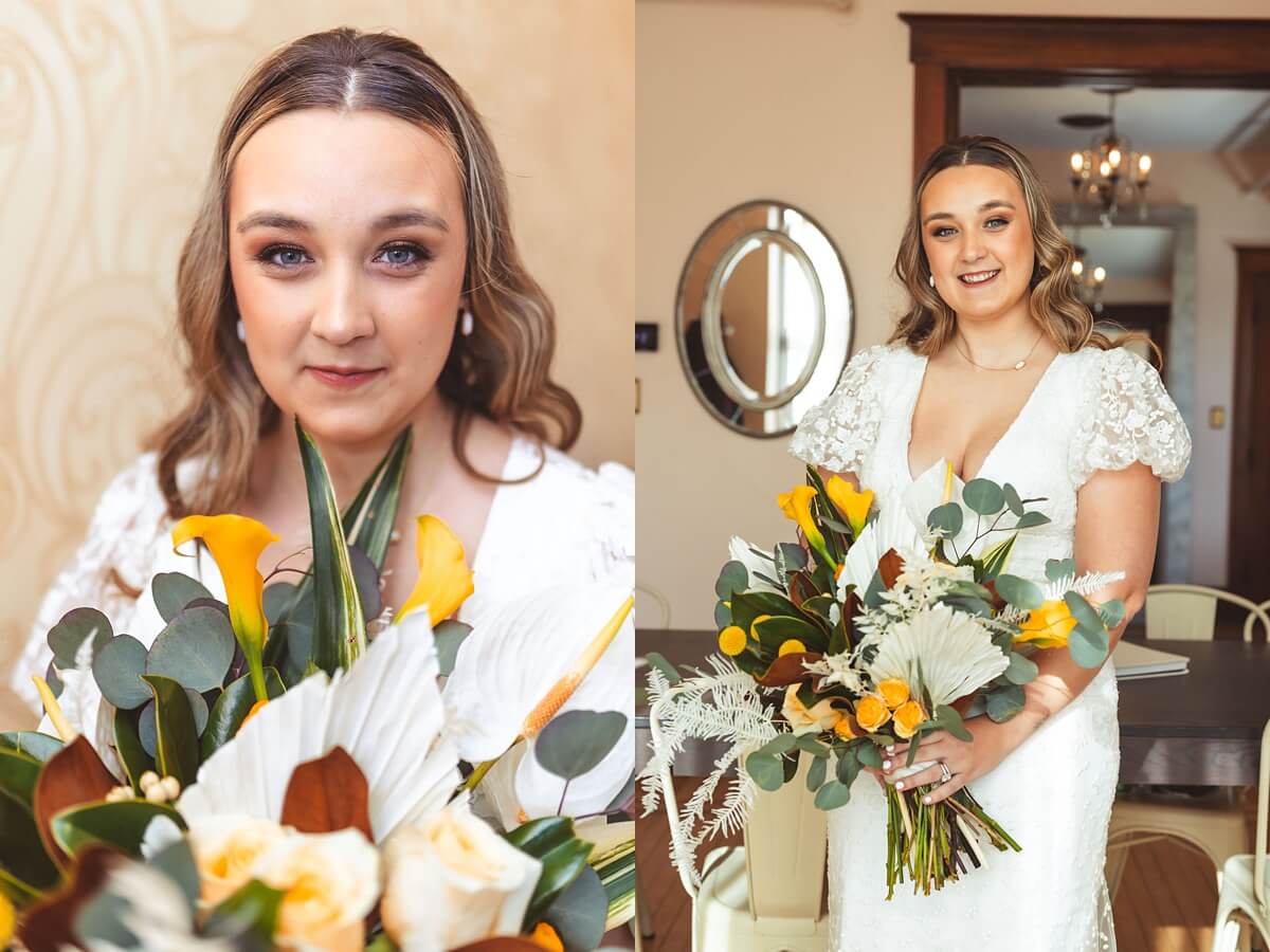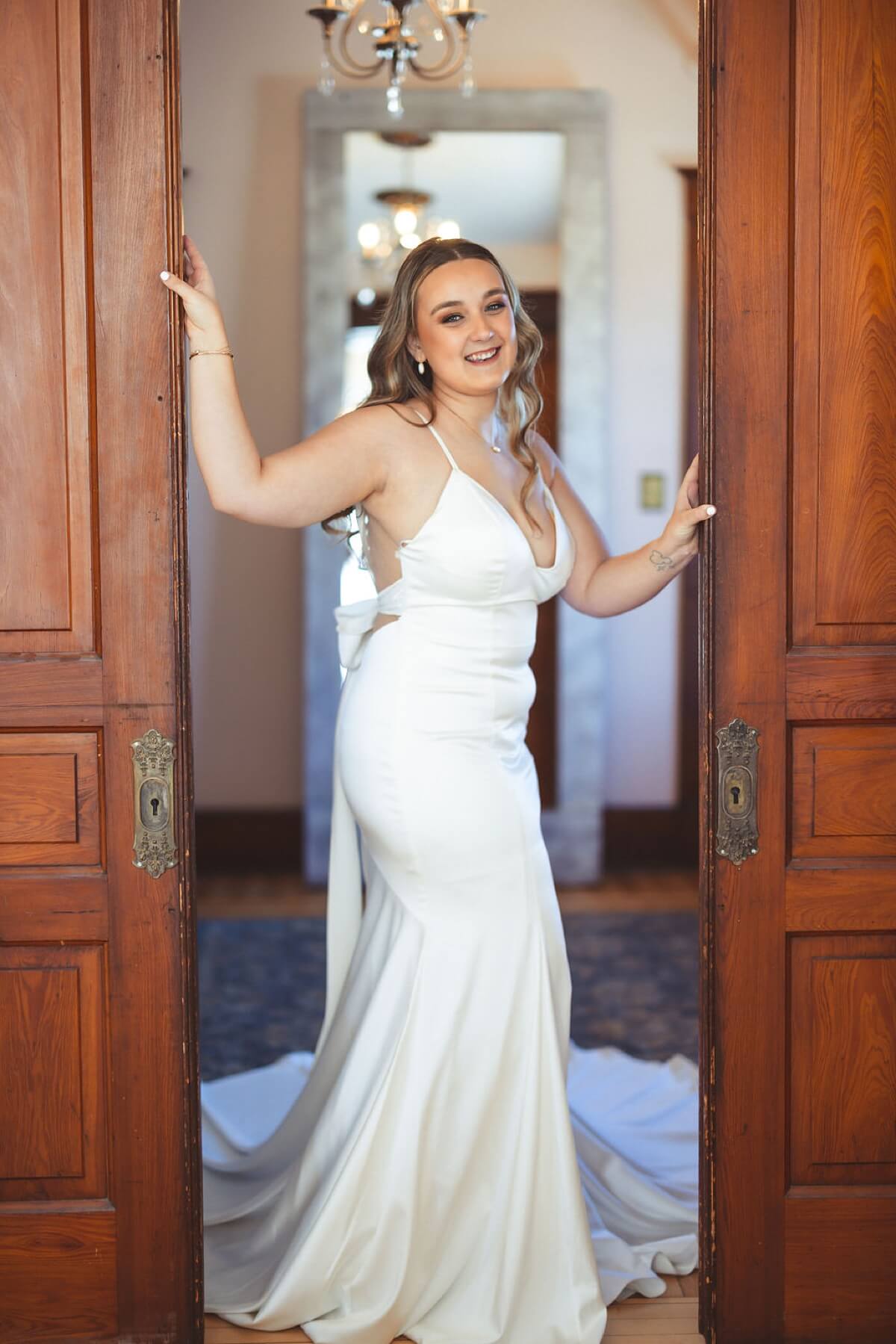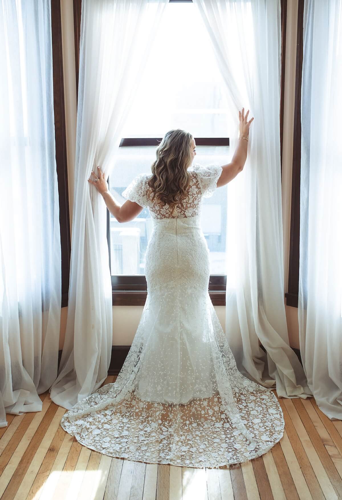 Our model, Madie, wore two dresses and took the most beautiful photos in our private suite. The lighting in the suites is perfect for bridal portraits, especially with the large windows and sheer curtains. We love the shots of Madie in between the wooden doors and on the blue velvet couch – the contrast between the couch and the white dress and yellow flowers is stunning!