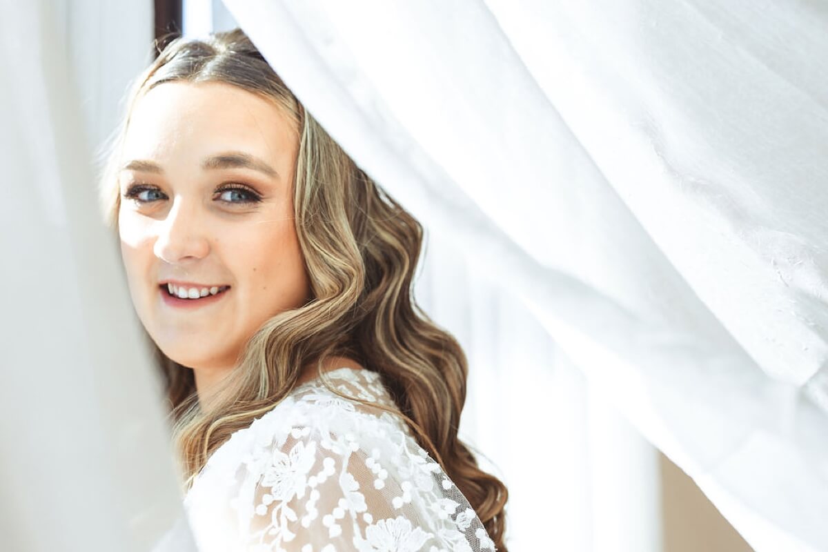 Our model, Madie, wore two dresses and took the most beautiful photos in our private suite. The lighting in the suites is perfect for bridal portraits, especially with the large windows and sheer curtains. We love the shots of Madie in between the wooden doors and on the blue velvet couch – the contrast between the couch and the white dress and yellow flowers is stunning!