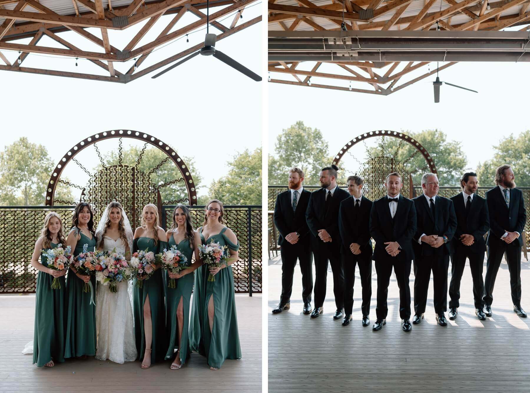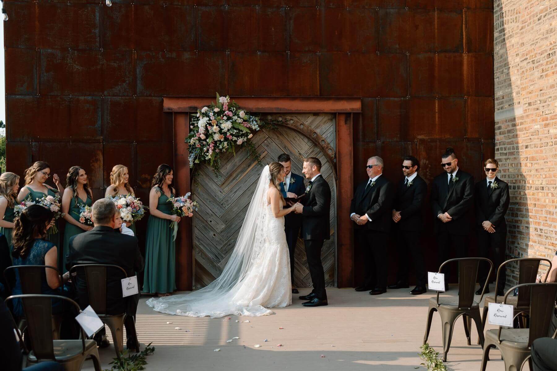 As an outdoor wedding venue in Illinois, we offer an outdoor ceremony space which Kaitlin and Nick opted to use for their wedding. Their ceremony decor was elegantly simple, allowing the natural beauty of the outdoor space to shine through. Greenery lined the aisles while the rustic ceremony backdrop was adorned with a breathtaking floral arrangement.