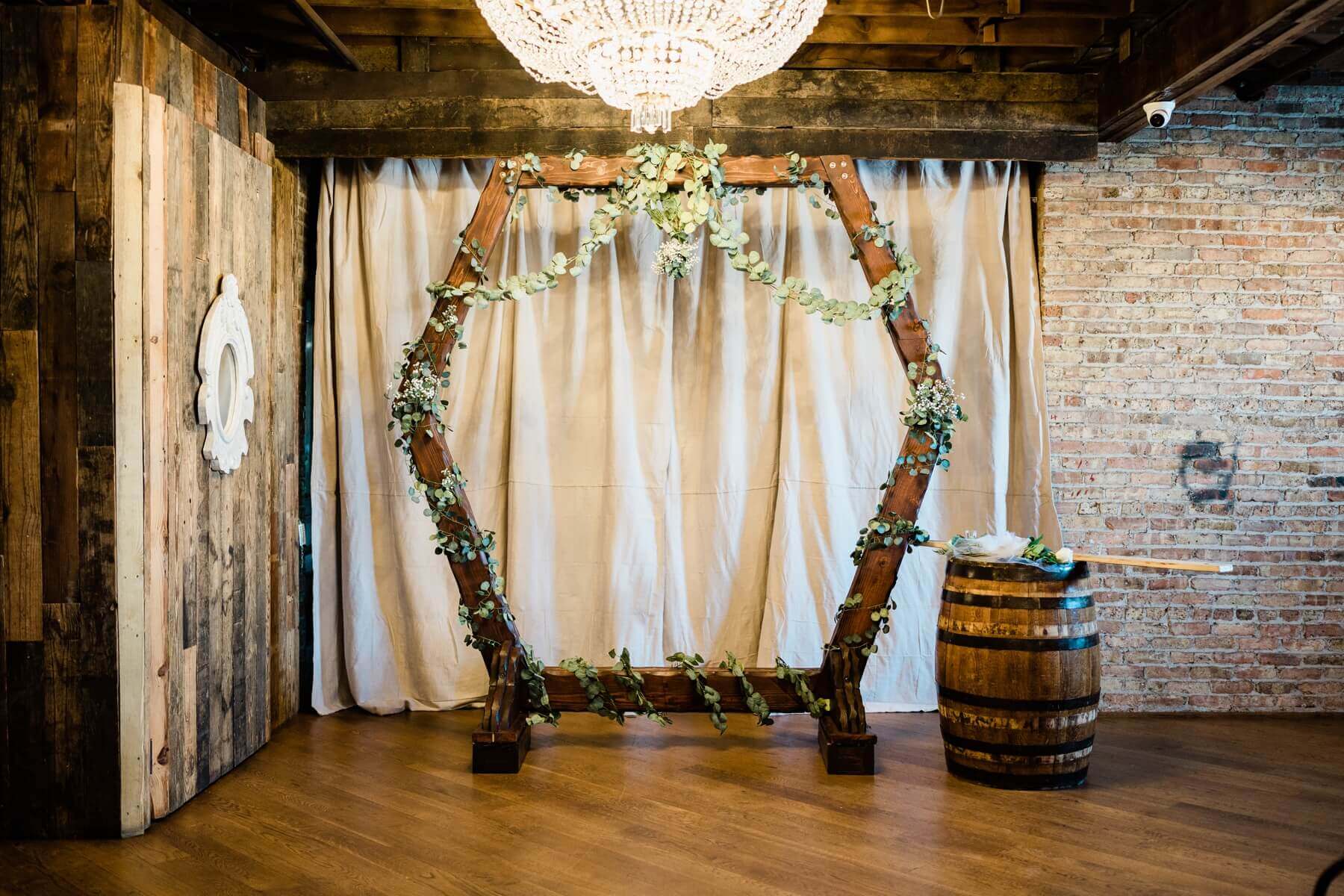 Guests gathered for the ceremony in the late afternoon. The couple chose our hexagonal arch which was adorned with white flowers and greenery. It served as the perfect backdrop to their ceremony along with our canvas curtain. Sydney and Nick exchanged vows in a beautiful, heartwarming ceremony. The Haight’s historical charm added an extra layer of magic to the ceremony. For a fun touch, the couple did a shotski right before they kissed and exited the ceremony!