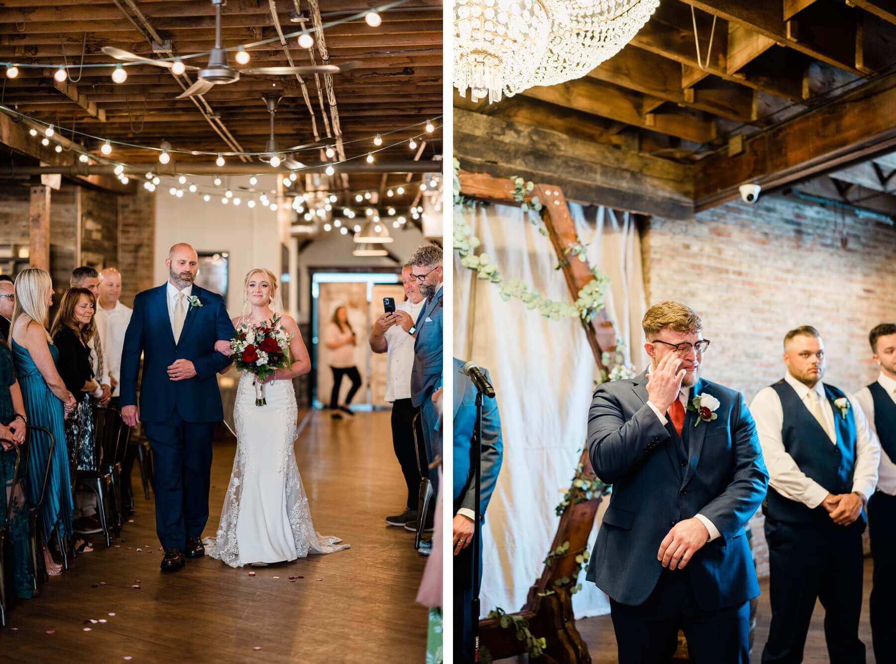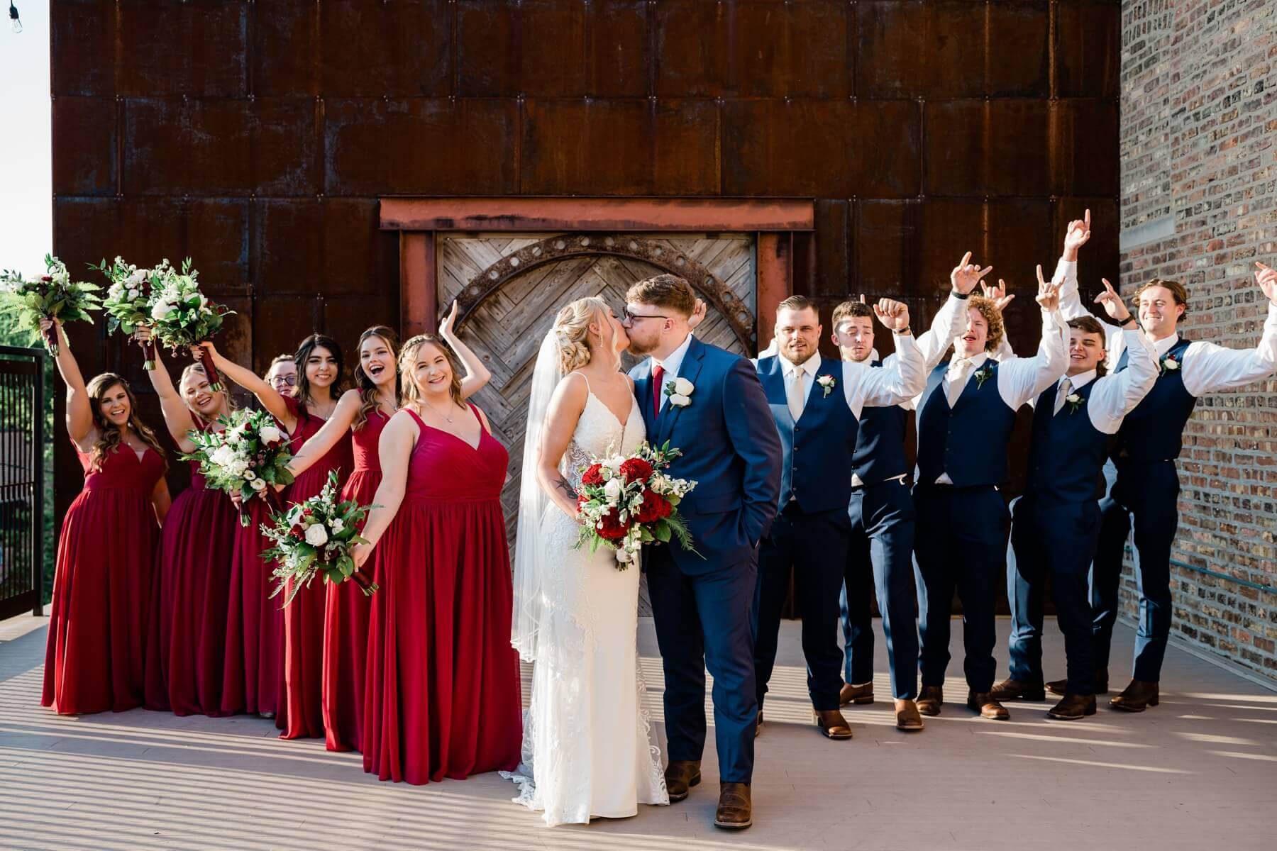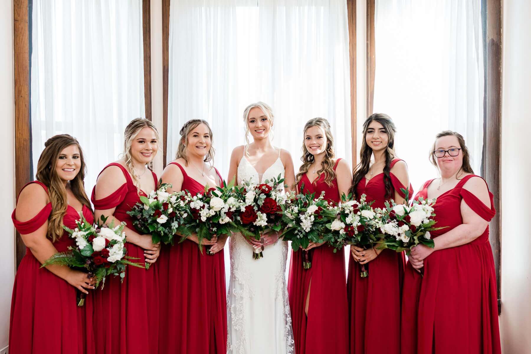 The wedding day began with the wedding party getting ready in the beautifully appointed suites at The Haight. Sydney was an absolute vision in her stunning lace gown with sheer cutouts. She also wore the prettiest white cowgirl boots with crystal details. The bridesmaids wore crimson gowns and carried bouquets full of red and white flowers which complemented Sydney’s bouquet perfectly. Nick and his groomsmen looked sharp in their tailored blue suits. The wedding party’s looks were perfect for the red and blue wedding.