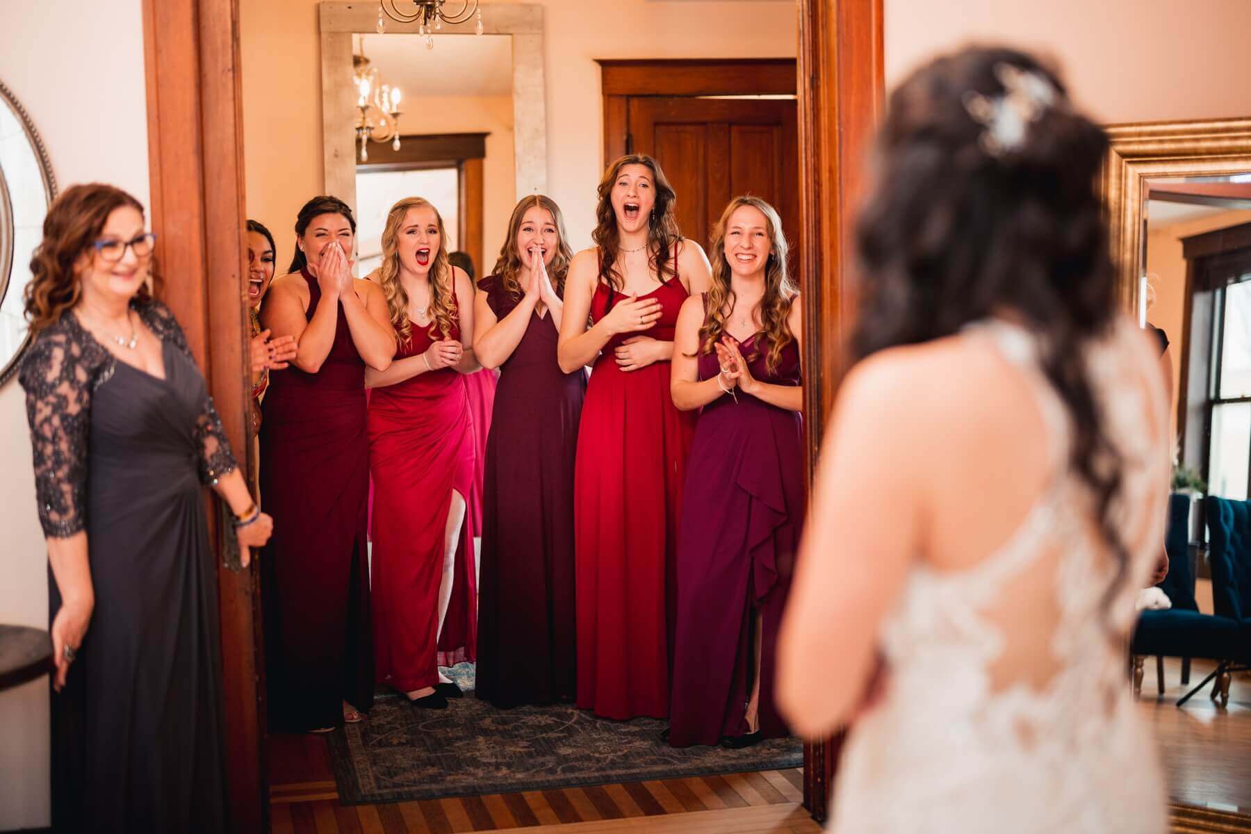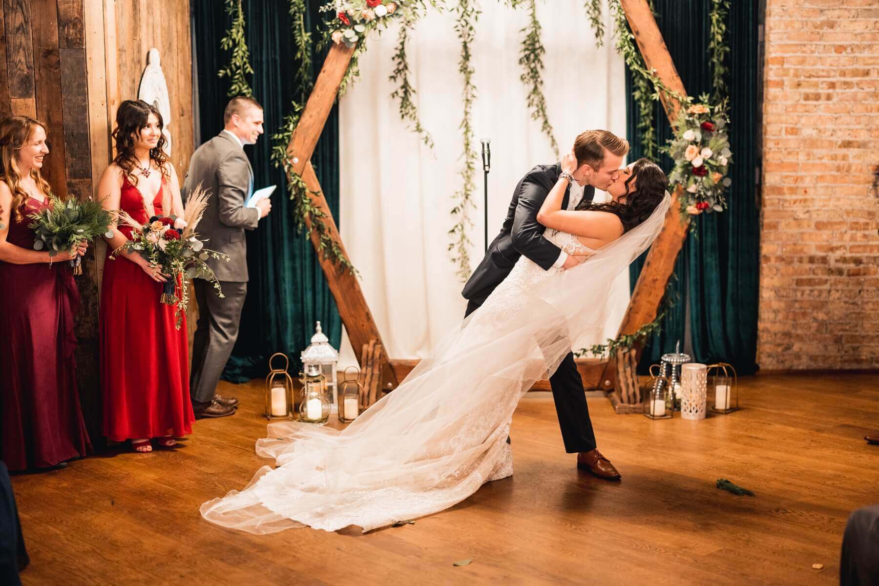 Olivia walked down the aisle with her dad and we loved seeing Colin tear up. The bridesmaids wore long mismatched dresses in shades of crimson that looked stunning against the brick and wood walls. Colin wore a classic dark navy suit while the groomsmen wore gray suits with ties in various shades of crimson. The couple exchanged vows and concluded the ceremony with a dip and a kiss. Then it was time to celebrate!