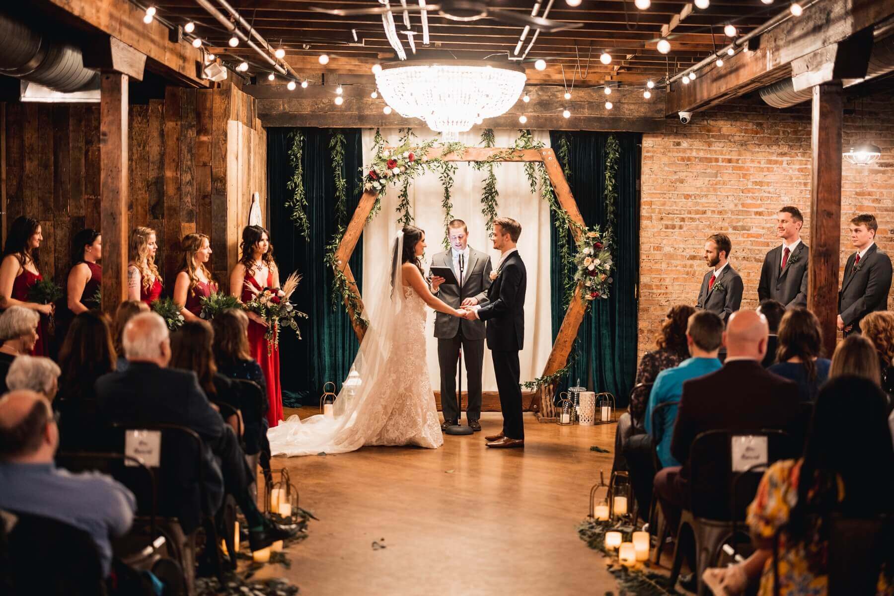 For their ceremony, Olivia and Colin chose to use our ivory chiffon and green velvet curtain paired with our hexagon arch. The arch had beautiful floral arrangements on it with flowers in shades of crimson, peach, and white with winter greenery woven throughout. We also liked how they hung greenery in front of the curtains to add a nice winter touch. The couple also used our candles and lanterns to line the aisle and in front of the arch to create a cozy feel. We love being one of the wedding venues in Illinois that offer these extra details so couples can completely customize their day. After the ceremony, you can party with your guests while some of the top performers for wedding parties are performing.