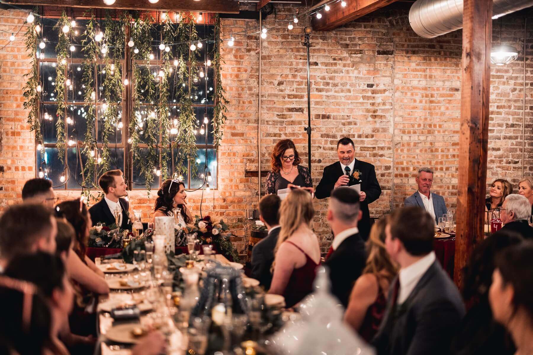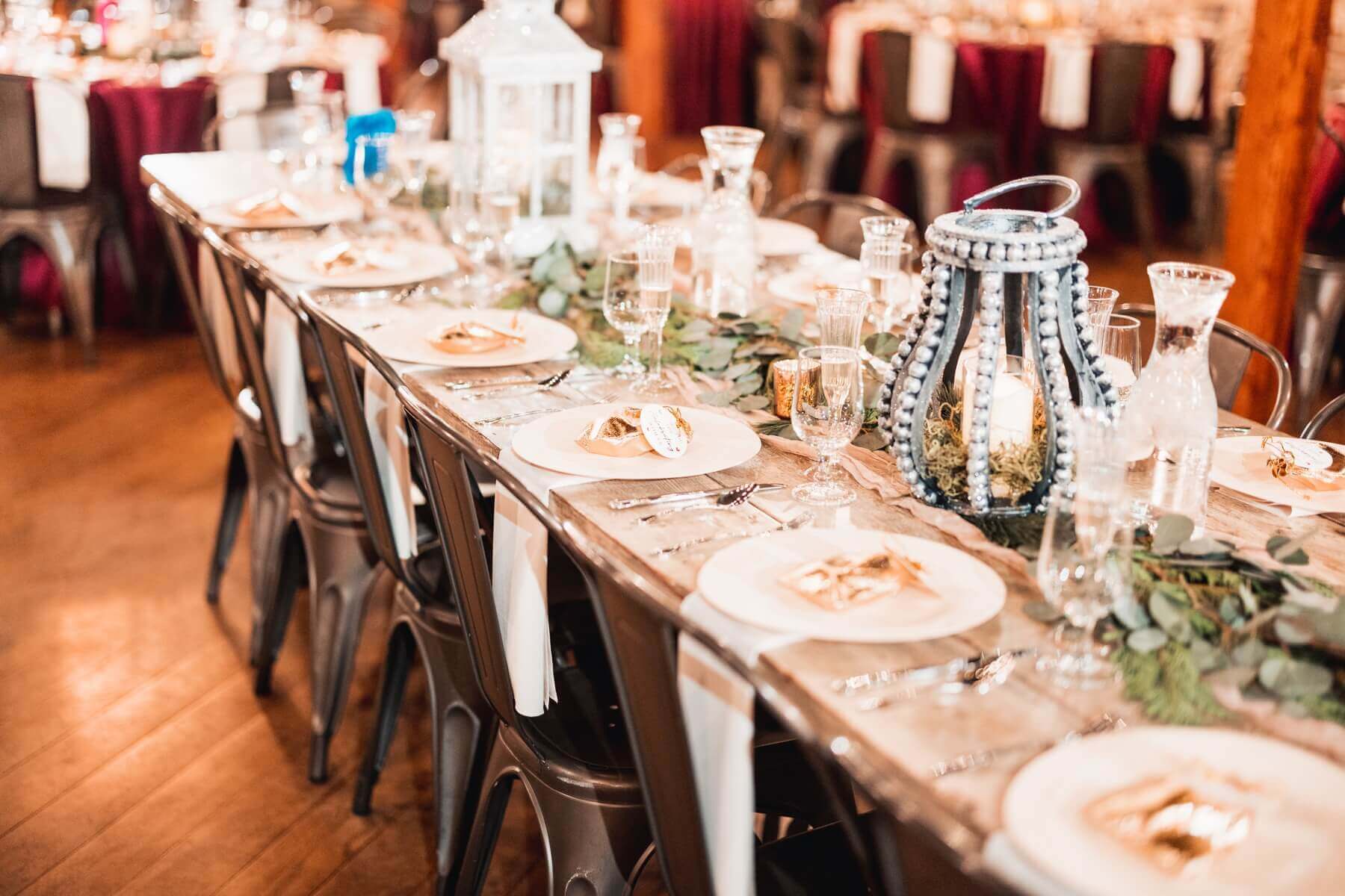 For the reception, Olivia and Colin used our round tables and our farm tables. They chose crimson tablecloths for the round tables and decorated the tables with our lanterns and rose gold votives. They added greenery to create a classic winter look. We loved how they hung greenery and twinkle lights behind the sweetheart table! Seeing how couples customize the space at our wedding venue in Illinois is always so fun to see!