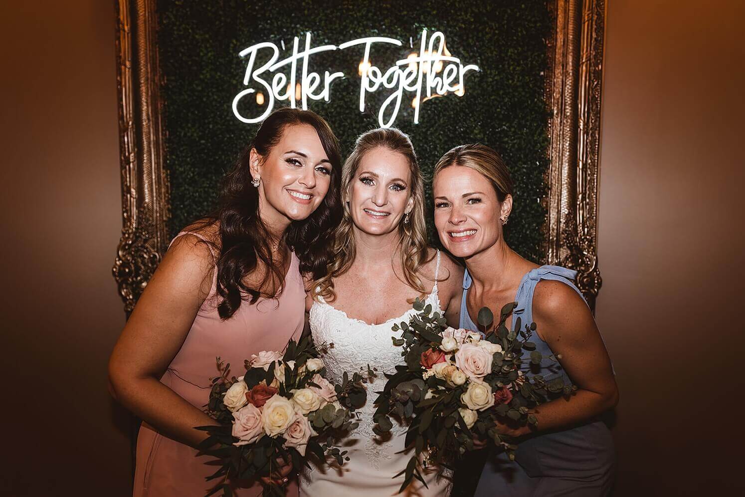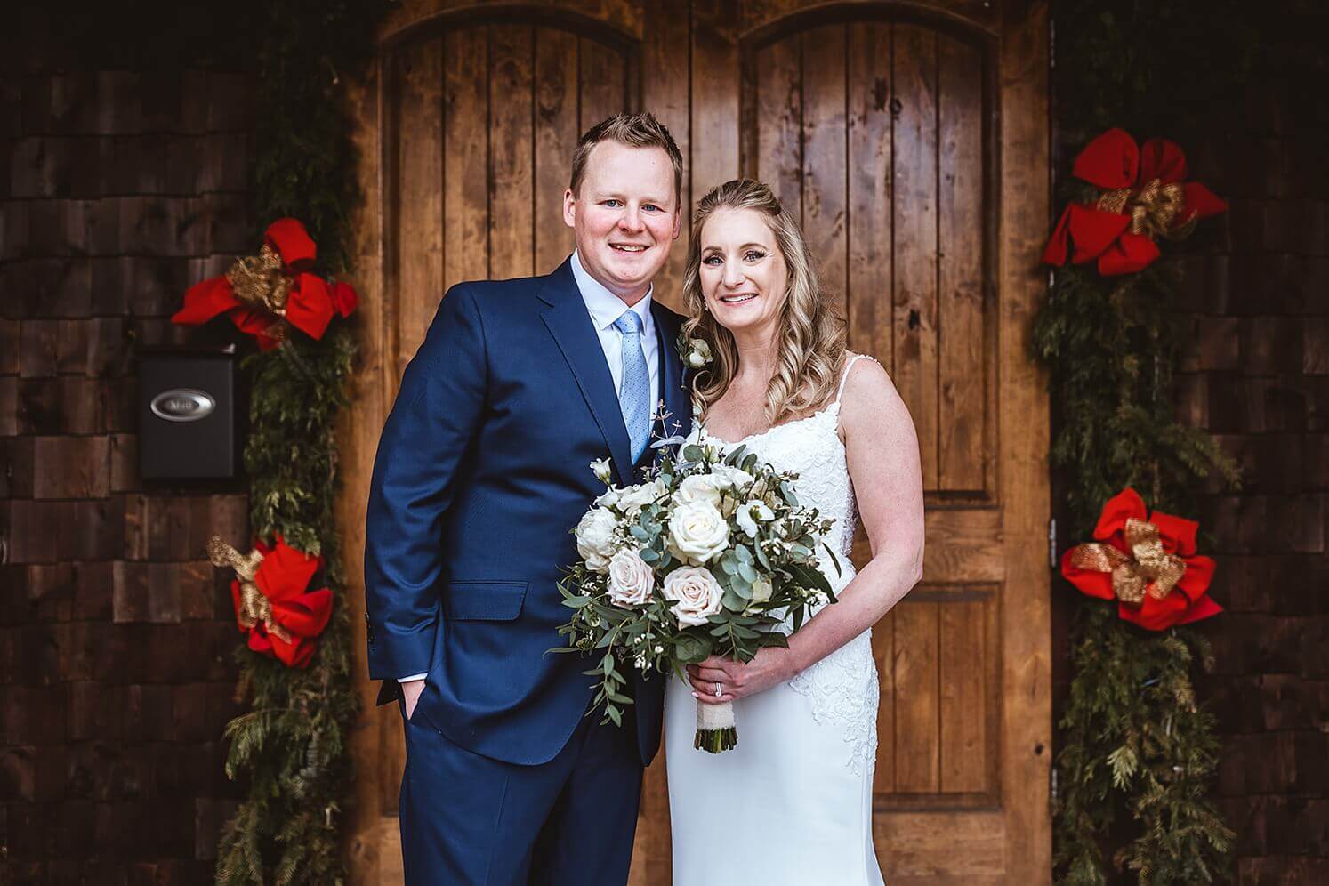 Katie and Jeff got ready with their wedding party in our suites where they enjoyed hanging out and even playing some Nintendo. After everyone was ready, Katie and Jeff did their first look at our front entrance. We loved how photographer Jill Tinogco captured the moment and the details of our front doors. As a winter wedding venue, we love decorating for the holidays, so our front doors had garland and red and gold bows around them to celebrate the season.