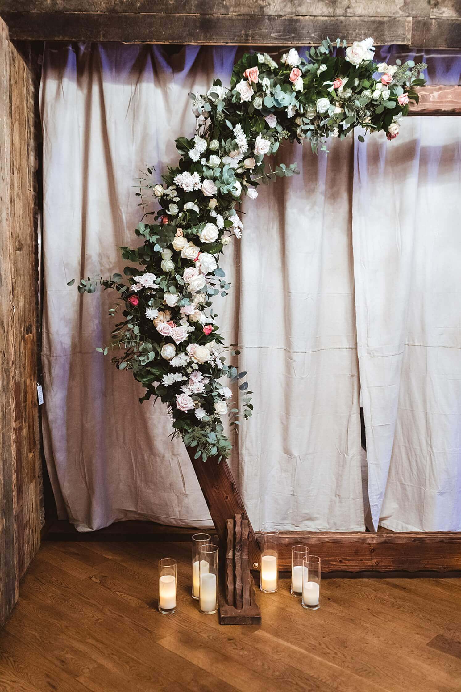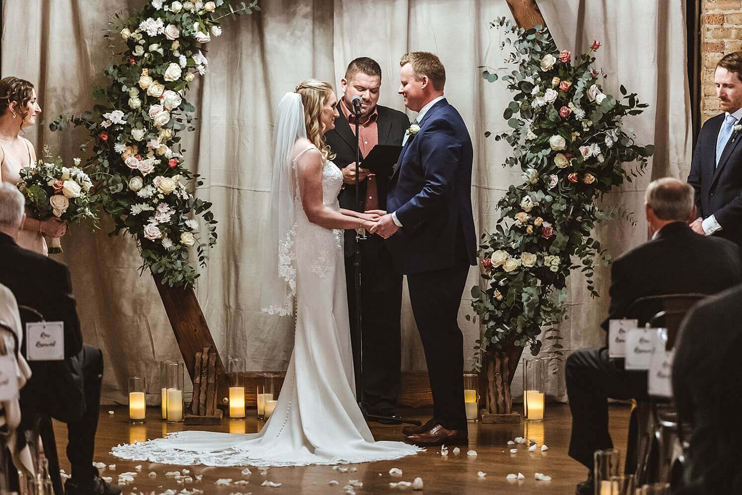 For their ceremony at our winter wedding venue, Katie and Jeff chose details that made it feel so cozy. They chose our canvas curtain backdrop with our hexagon arch for their ceremony. The arch was adorned with roses in various shades of white and pink along with plenty of greenery to give it a wintery feel. They lined the aisle with candles in hurricane vases which made the space feel very intimate. Katie and Jeff exchanged beautiful personal vows, then it was time for cocktail hour!