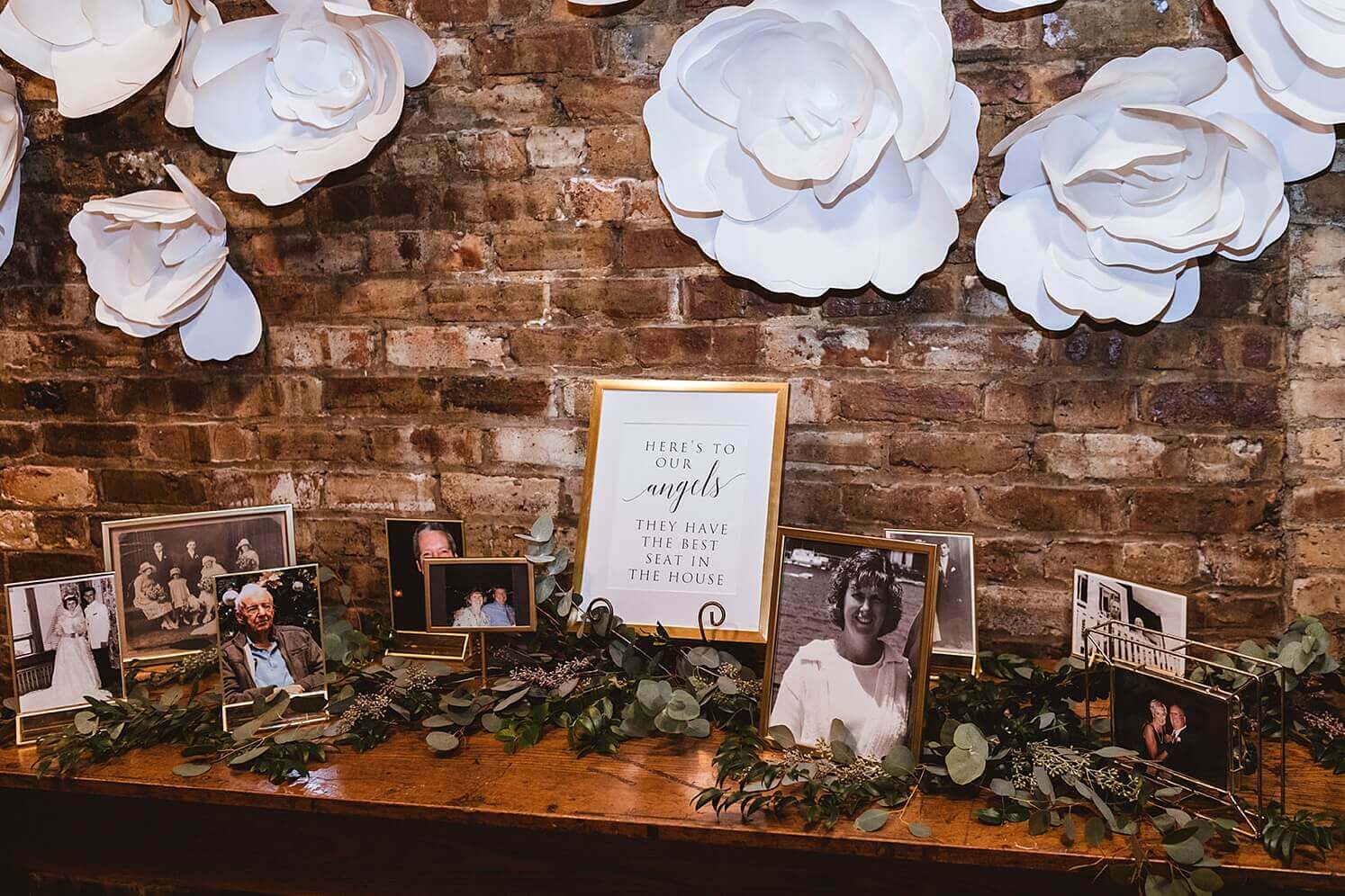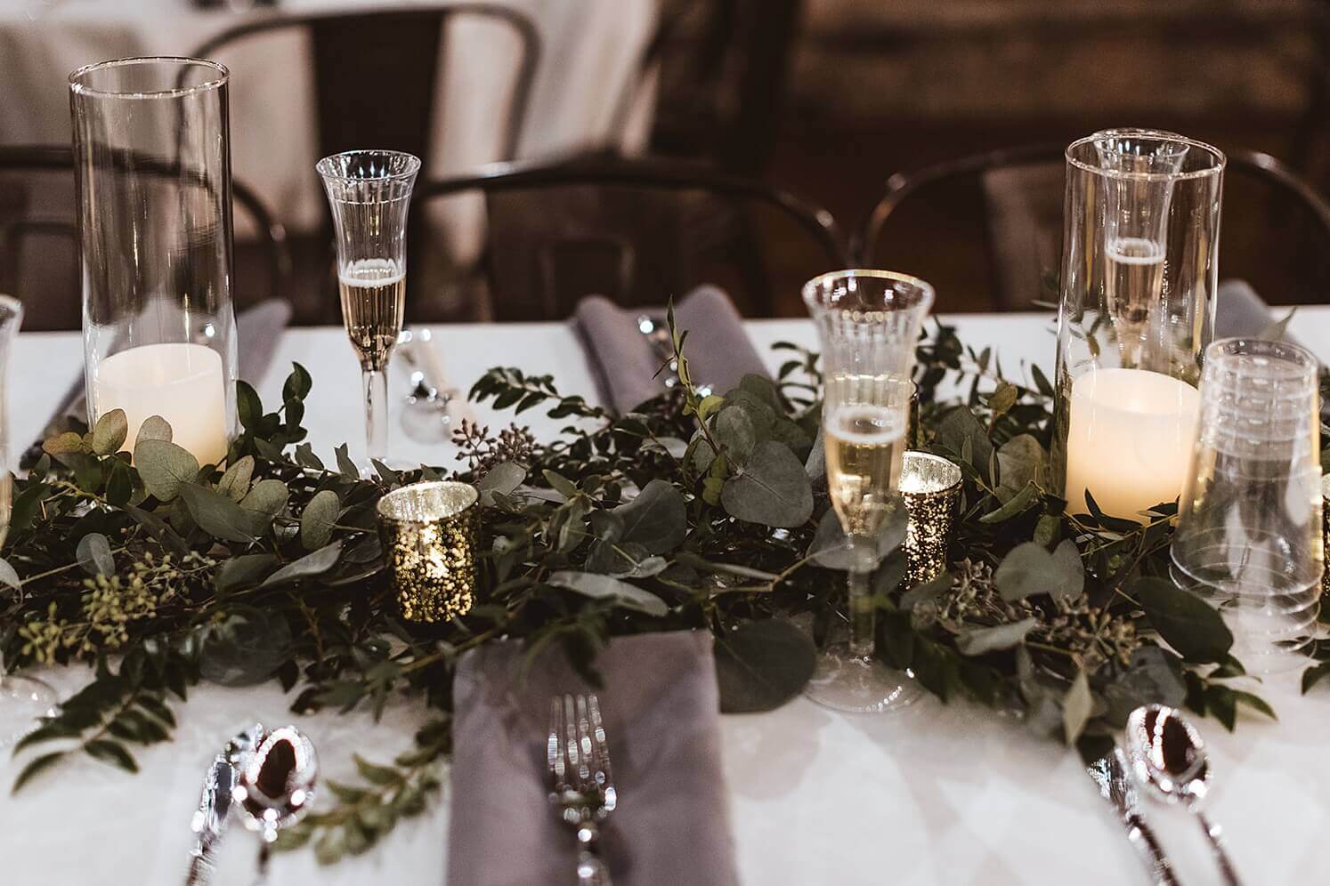 At the reception, they chose white table cloths with greenery and white candles as their centerpieces. They also chose white signage with black writing for their seating chart, place cards, and table numbers. These touches created a classic winter wedding look, especially under the twinkle lights.